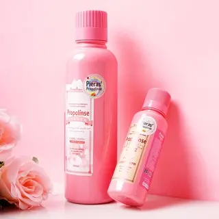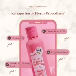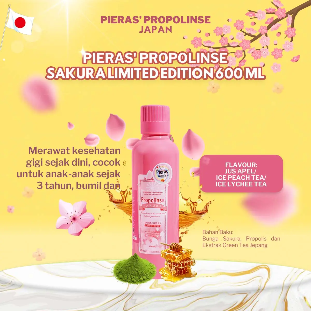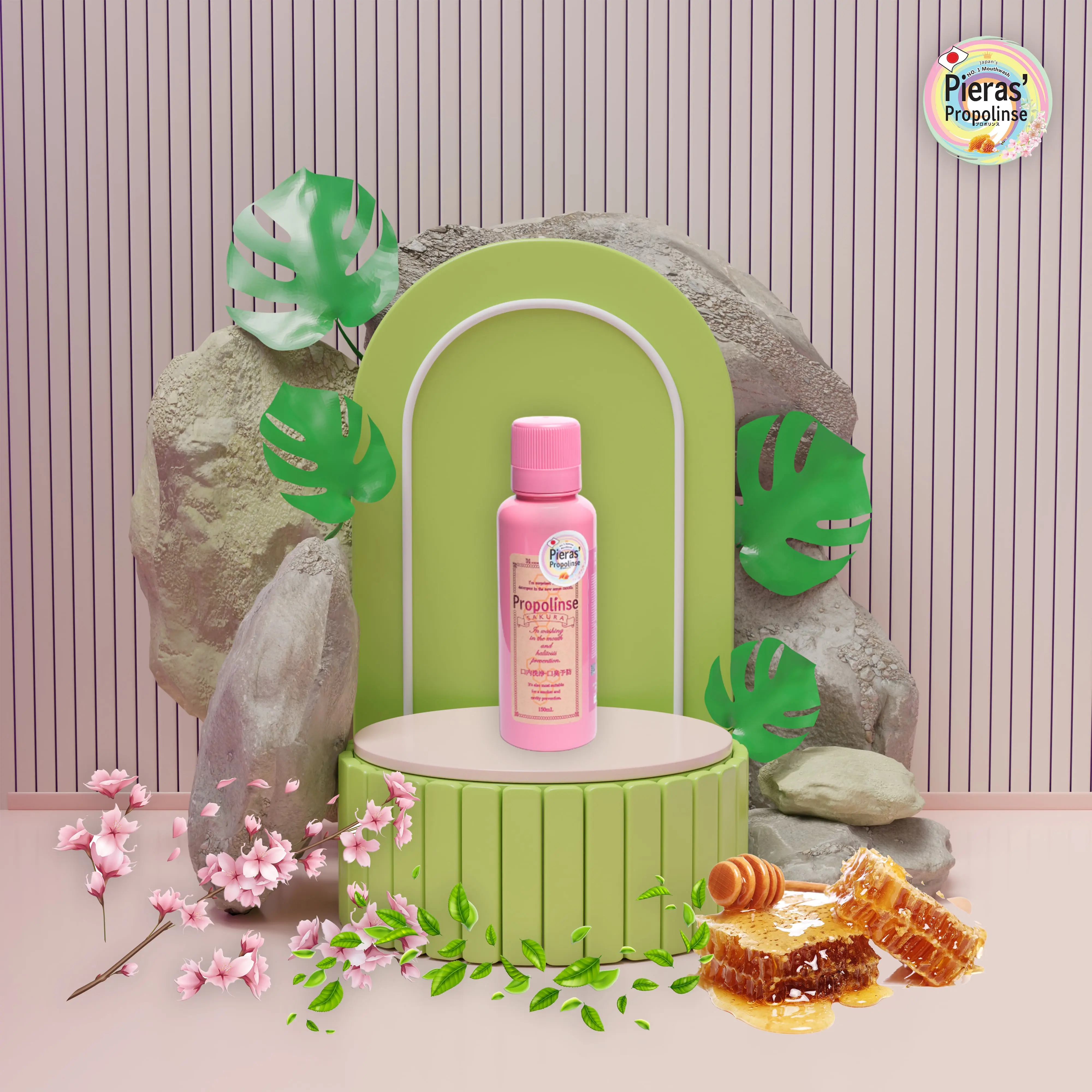 Obat kumur PIERAS PROPOLINSE terbuat dari propolis extracts, green tea, bunga sakura Jepang dan natural xylitol.