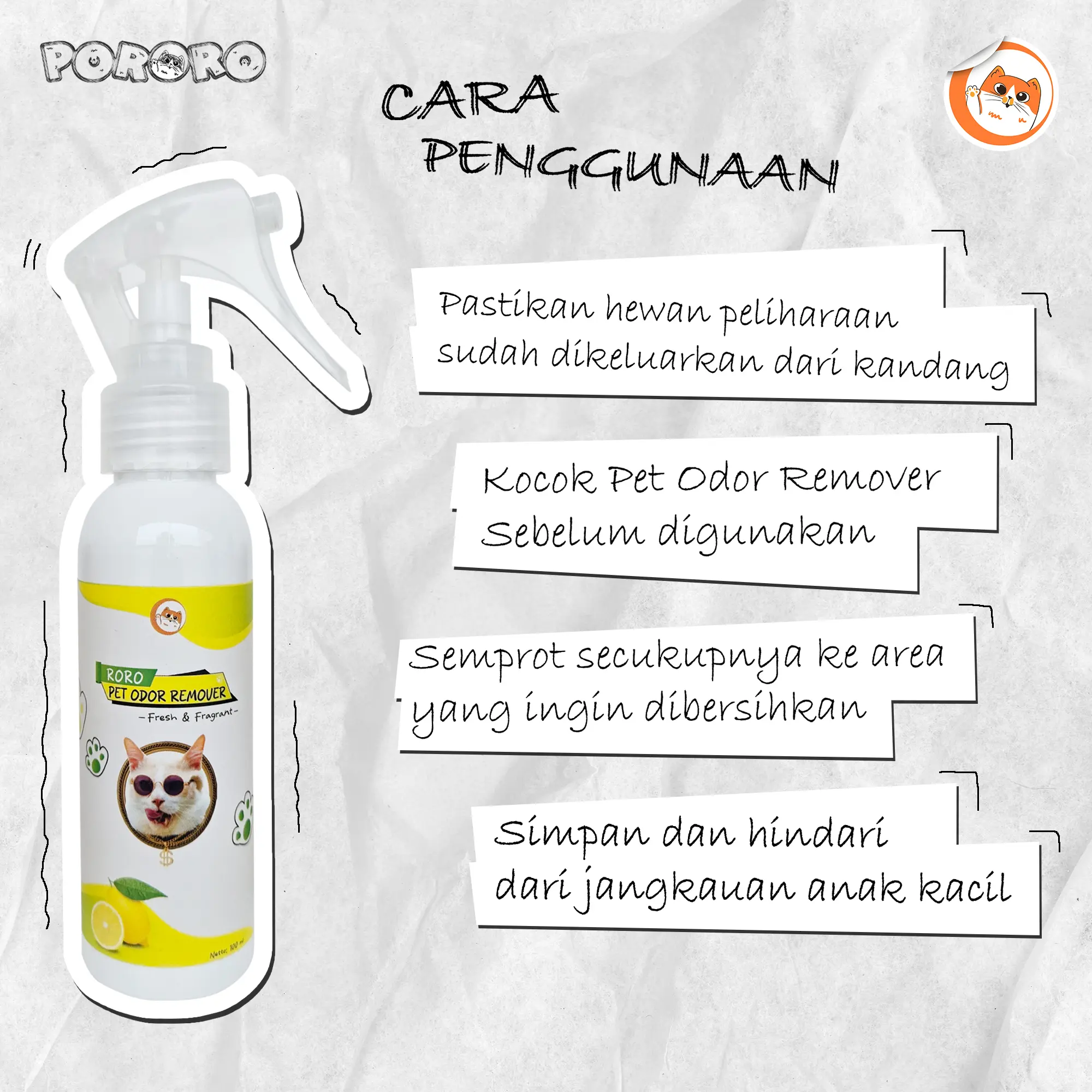 Bersihkan area yang berbau, buang kotoran atau sisa-sisa yang menyebabkan bau. Pastikan botol dikocok terlebih dahulu, kemudian semprotkan RORO PET ODOR REMOVER ke area yang berbau. Bisa disemprotkan pada kandang hewan, litter box, karpet, sofa dan lain-lain.