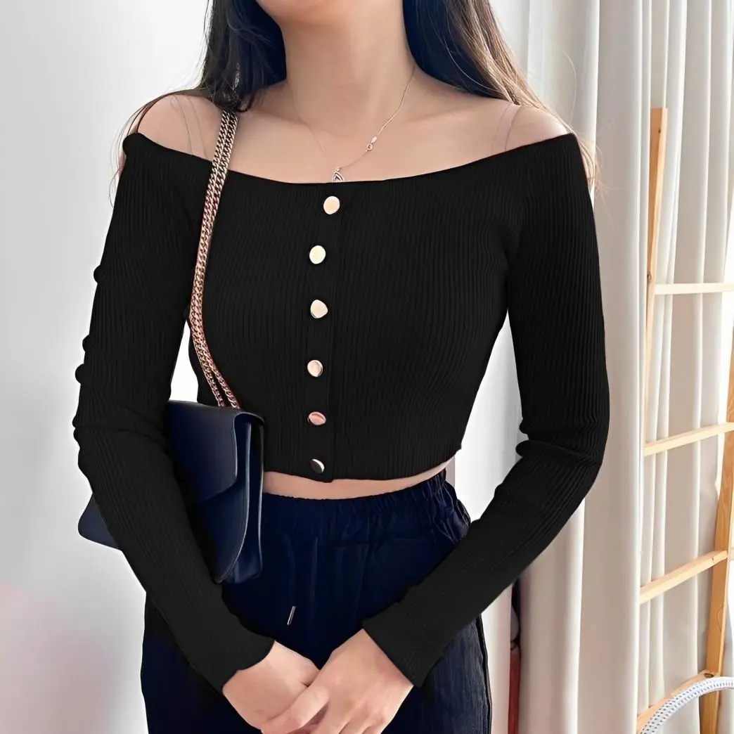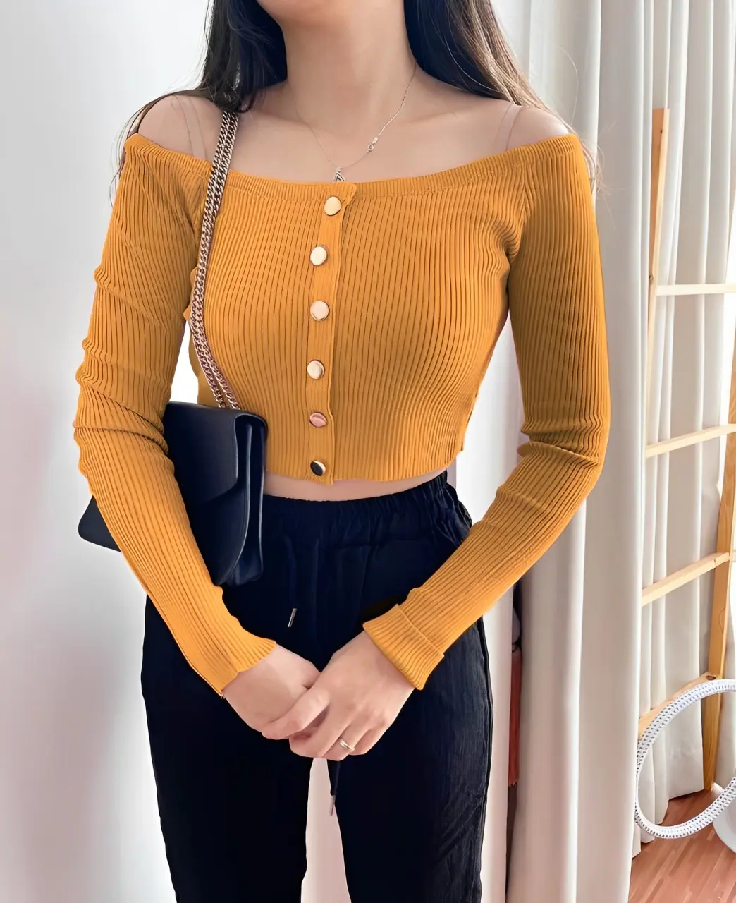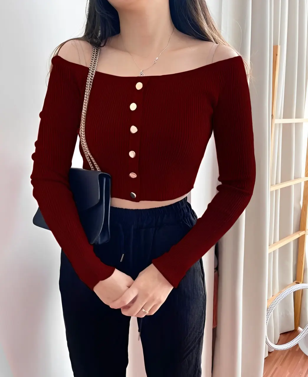 Blouse Rajut Sabrina adalah Blouse Rajut wanita yang terbuat dari Benang Cotton Polyester