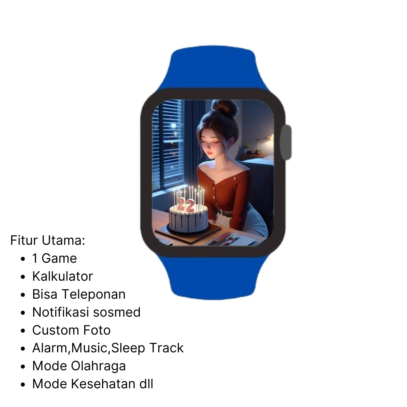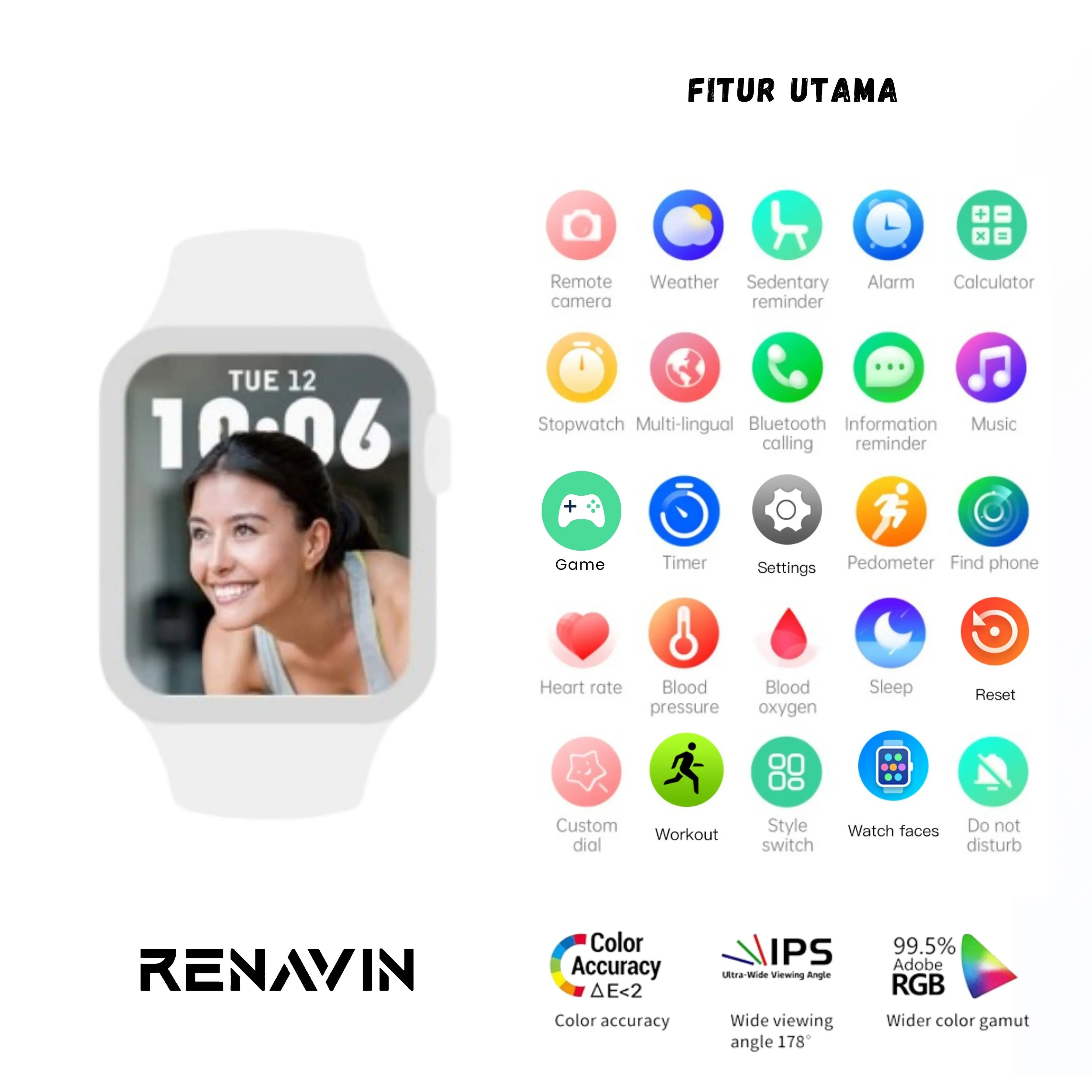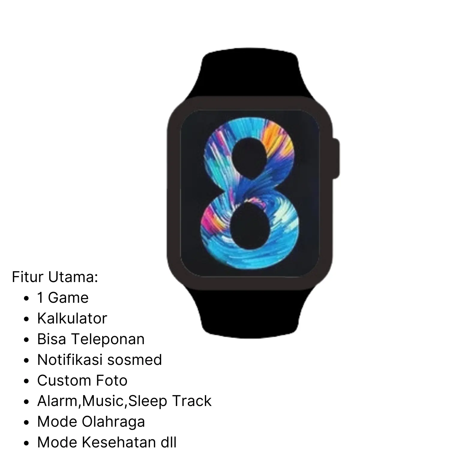 ·Fungsi Lain: Pangilan Bluetooth, Buku telepon, Rekam gerak, detak jantung, Pemantauan tekanan darah, Latihan fisik, Pengingat menetap, Pemantauan oksigen darah, Musik BT, Pemantauan tidur,Pengaturan tgl & hari, Alarm jam, Pengambilan foto jarak jauh, Mencari ponsel ,Notifikasi