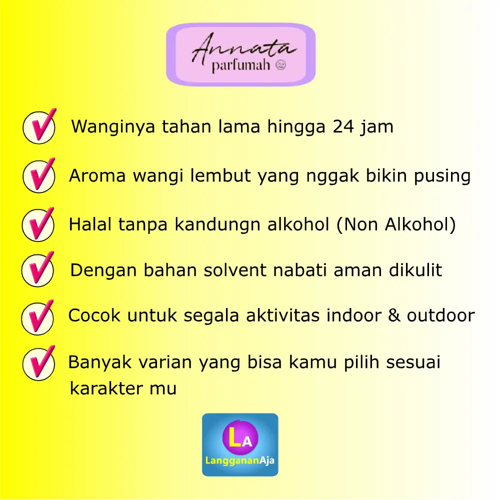 Annata Parfumah menghadirkan rangkaian parfum HALAL menggunakan bahan solvent nabati tanpa alkohol (Alcohol free) jadi aman untuk sholat dan telah terdaftar & ijin BPOM. Annata Parfumah adalah jenis "Extrait De Parfume" daya tahan wanginya 24 jam.