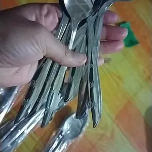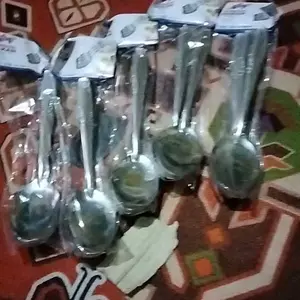 Paket dibungkus kardus dan plastik hitam aman selamat sampai tujuan. Sendok satu plastik ada 12 biji, semua 5 bungkus plastik. Jadi total sendok ada 60. Model polos murah meriah dapet banyak
