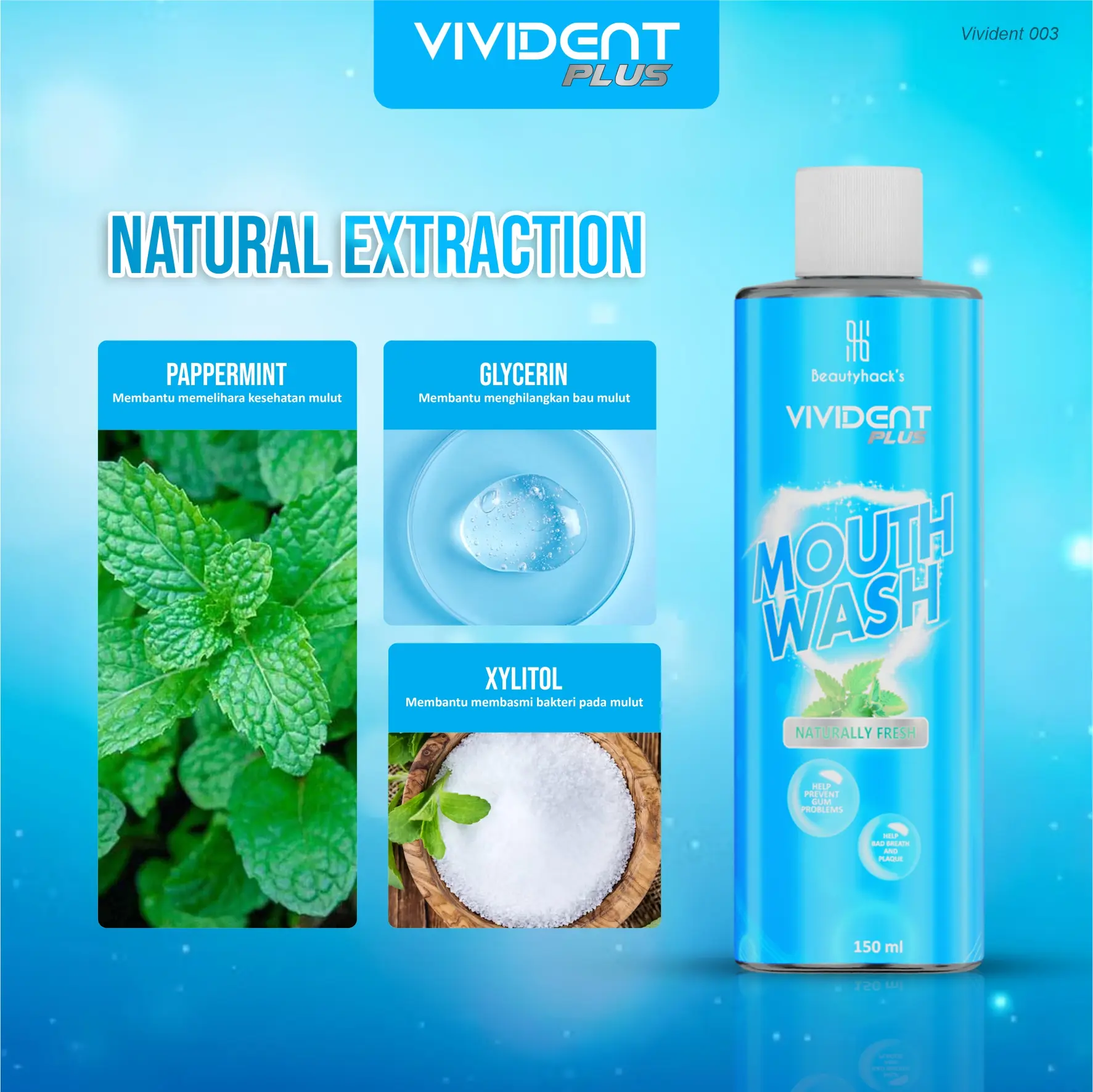 Vivident Plus Mouth Wash - Pembasmi Bakteri & Bau Mulut Vivident Plus Mouth Wash dapat membantu menjaga kesehatan gigi dan mulut dengan segar dan bebas bau mulut. Diformulasikan dengan kandungan antibakteri, Vivident Plus Mouth Wash dapat membantu membasmi bakteri yang menyebabkan bau mulut dan mencegah terbentuknya karang gigi.