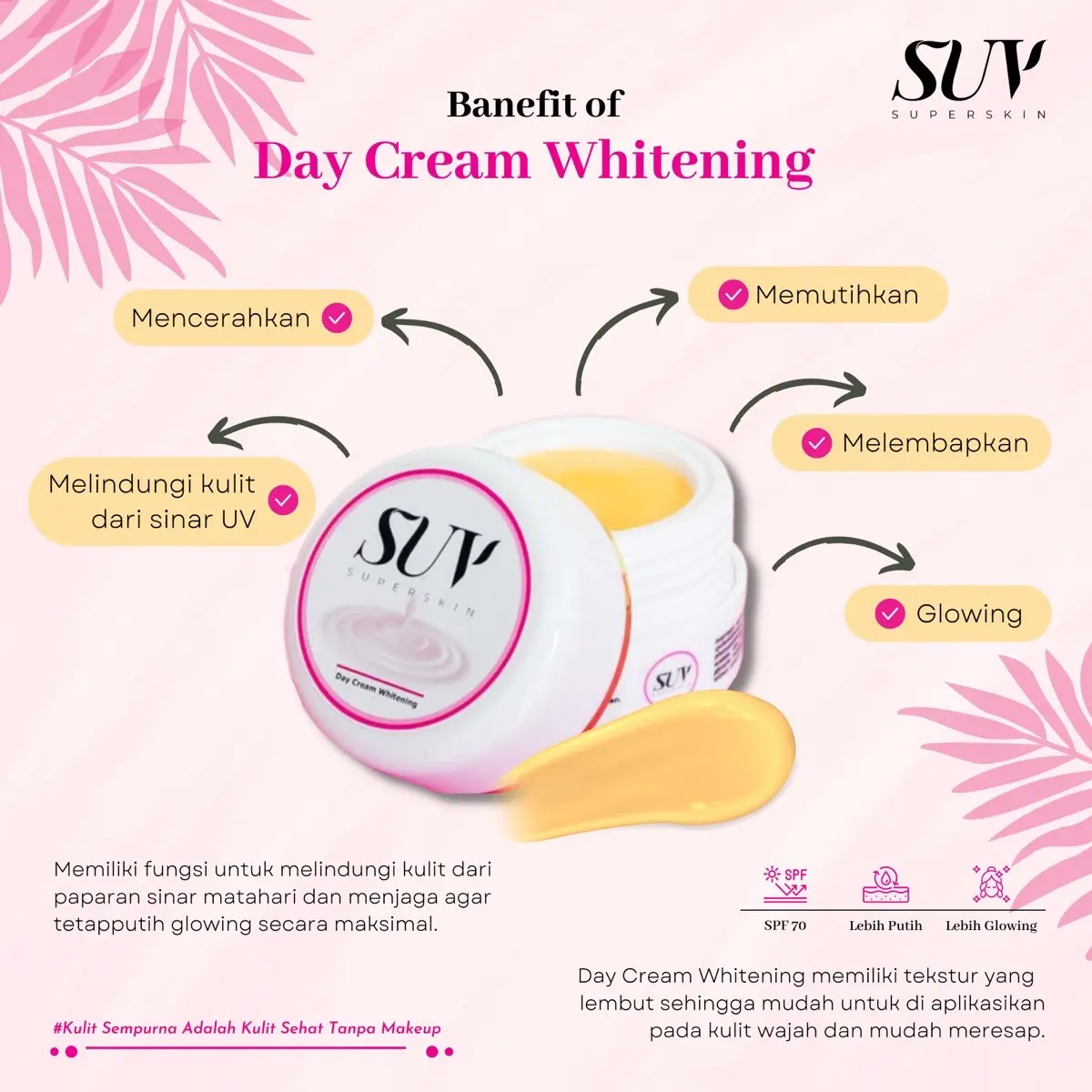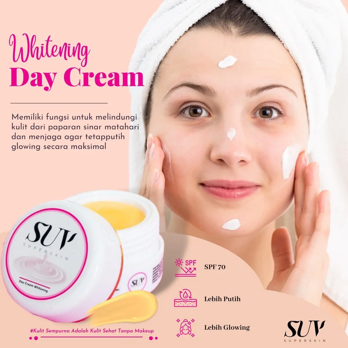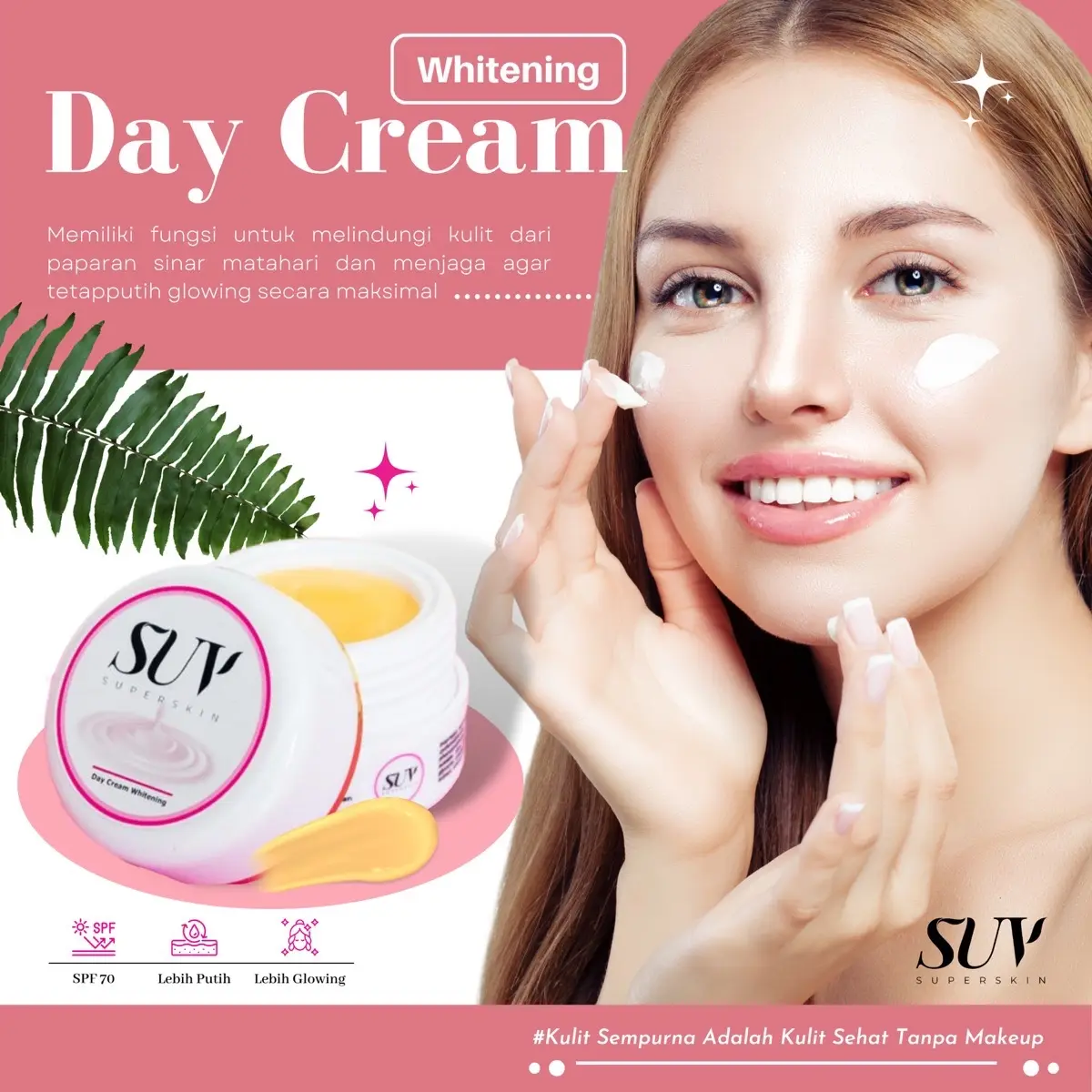 DAY CREAM WHITENING SUV mampu melindungi kulit dari paparan sinar matahari agar tidak belang. Didalamnya sudah ada kandungan sunscreen dan SPFnya :)
