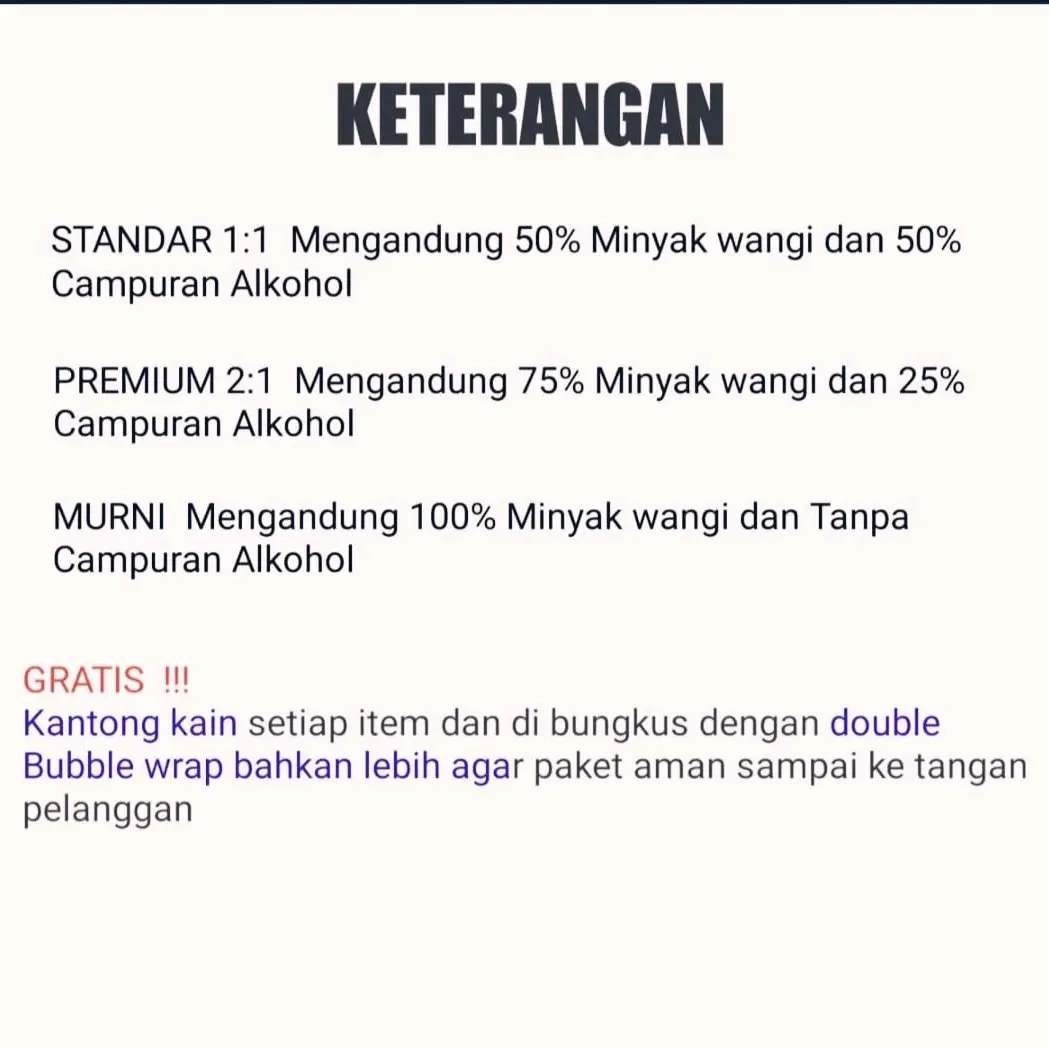 Parfum Refill Premium 212 Sexy, 212 Man, 212 Women, dan 212 VIP tahan lama non alkohol isi 30ml,50ml,dan100ml Uniseks Fruity Bunga fresh (bonus sarung) adalah pilihan terbaik untuk Anda yang ingin tampil segar dan harum sepanjang hari. Key Features: - Dijual dalam ukuran yang berbeda: 30ML,50ML,dan100ML. - Ada tiga jenis perbandingan campuran bibit parfum. - Murni tanpa campuran alkohol. - Harga sudah termasuk bonus kantong kain untuk melindungi produk saat pengiriman. Harap perhatikan bahwa varian murni harus dioleskan pada kulit atau diteteskan pada pakaian karena langsung disemprotkan ke pakaian bisa menyebabkan noda. Kami menjamin produk kami dengan double packing bubble wrap agar aman selama pengiriman ke tempat Anda. Jangan lupa memberikan ulasan positif jika puas dengan produk kami. Terbuat dari bahan minyak wangi berkualitas tinggi dan diproduksi di Indonesia dengan umur simpan selama enam bulan. Produk ini cocok digunakan bagi Anda yang sensitif terhadap bahan kimia tertentu karena tidak mengandung alkohol atau aerosol serta tidak ada informasi alergen. Segera miliki Parfum Refill Premium ini sekarang juga agar penampilanmu semakin sempurna!