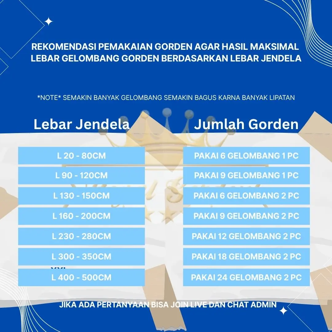 ~ 1 lembar gorden IDEAL untuk jendela lebar 40 - 80cm. ~ 1 lembar gorden bisa di gunakan untuk jendela maximal 100 cm. ~ lebih dari ukuran di atas di sarakan pakai 2 lembar