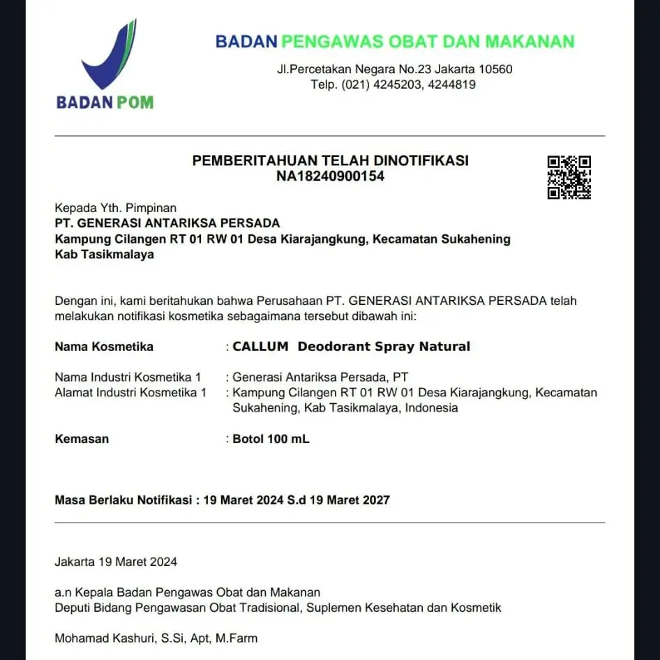 Key Features: - Mengandung tawas untuk mengatasi bau ketiak - Terdiri dari lima kemasan spray - Dapat memberikan aroma segar sepanjang hari Produk ini memiliki Nomor Registrasi BPOM NA18240900154 dan dapat disimpan selama 12 bulan.