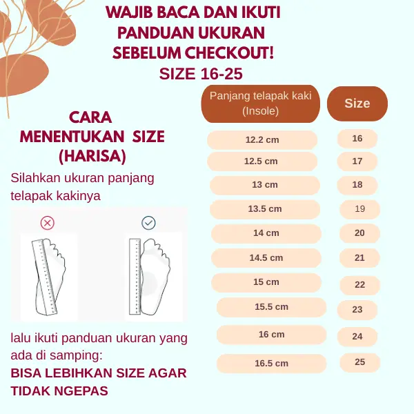 - - Cara untuk mendapatkan size yang tepat: ukur panjang telapak kakinya lalu ikuti panduan ukuran (ada di keterangan produknya).