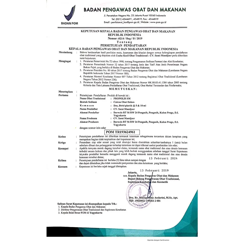Propolis SM terbuat dari 100% propolis brazil asli kualitas premium, dengan rasio 7:1 tanpa campuran alkohol dan bahan lainnya. Serta diolah secara canggih dengan teknologi nano, sehingga khasiatnya lebih cepat dan efektif dirasakan dibandingkan dengan produk serupa lainnya.