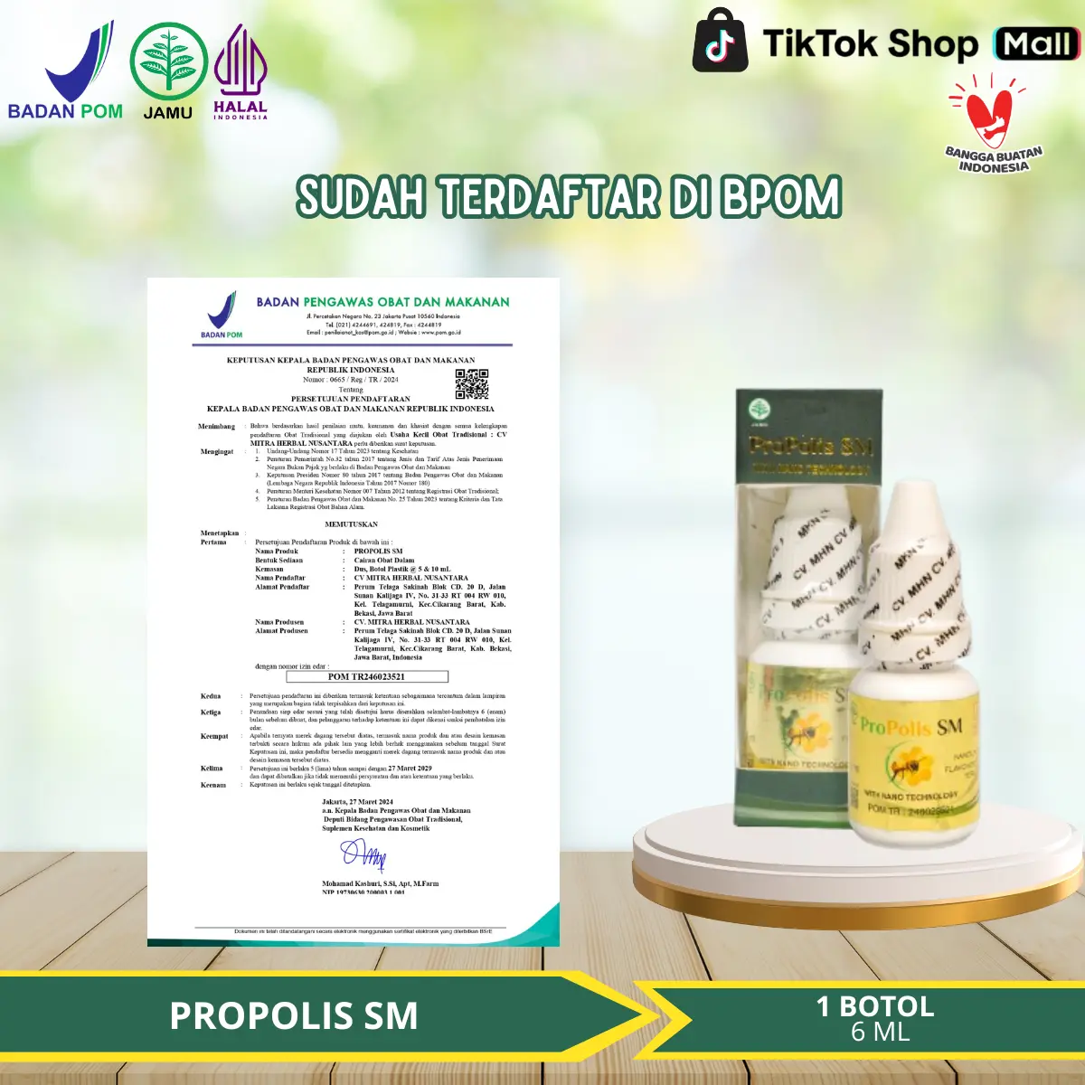 Diproduksi di Indonesia, Propolis SM hadir dalam kemasan 6ml dengan nomor registrasi BPOM POM TR246023521. Segera hilangkan keloid bekas luka menonjol Anda dengan Propolis SM!