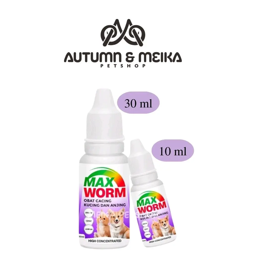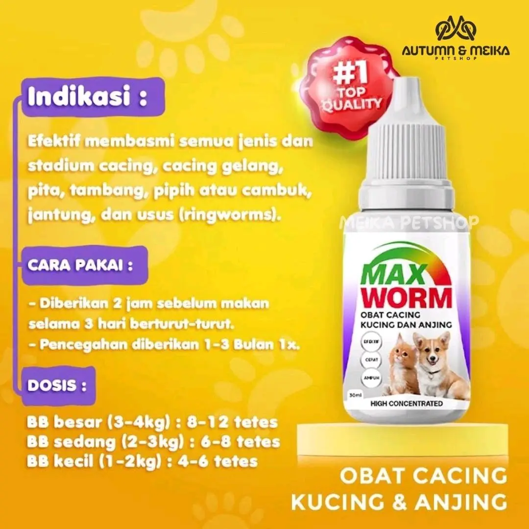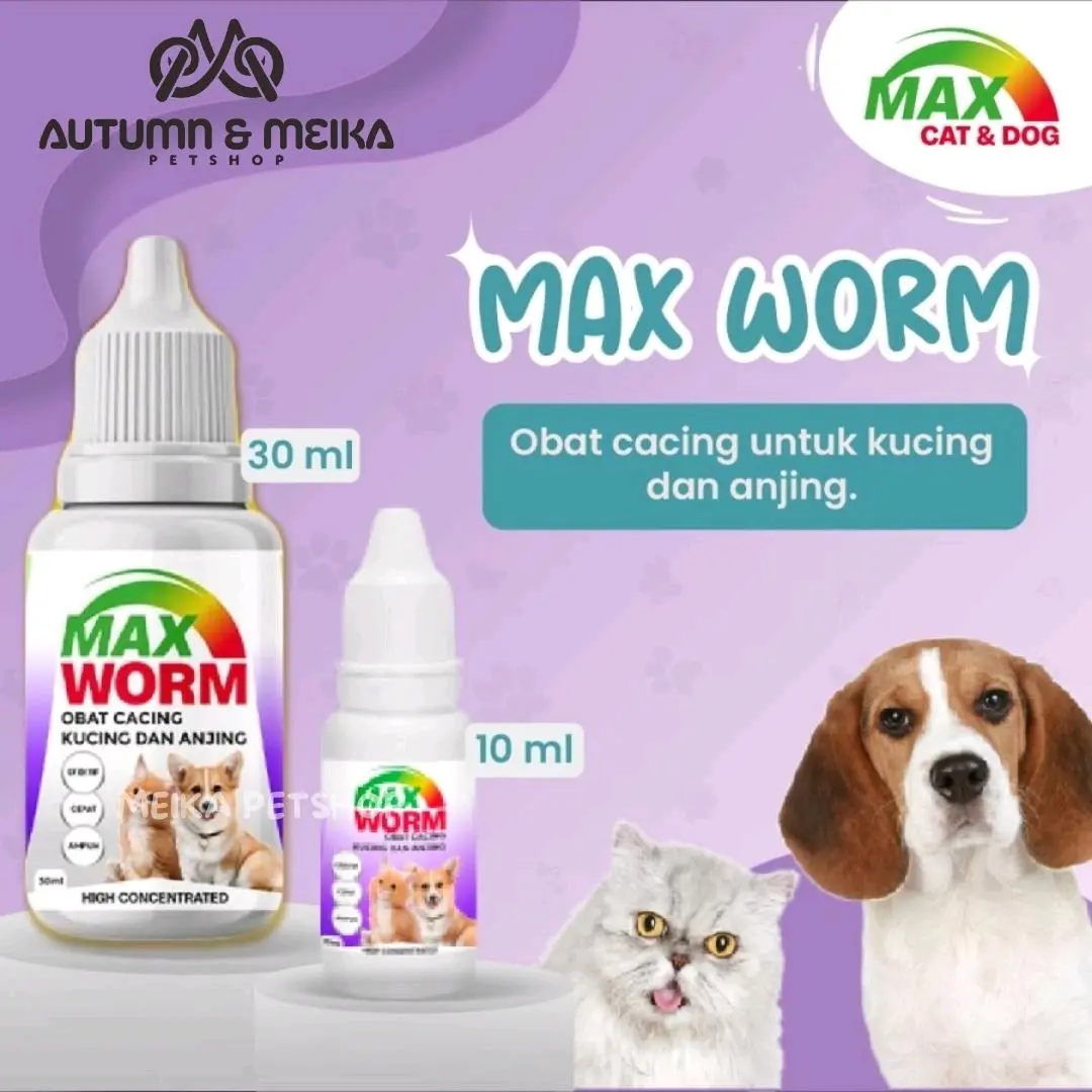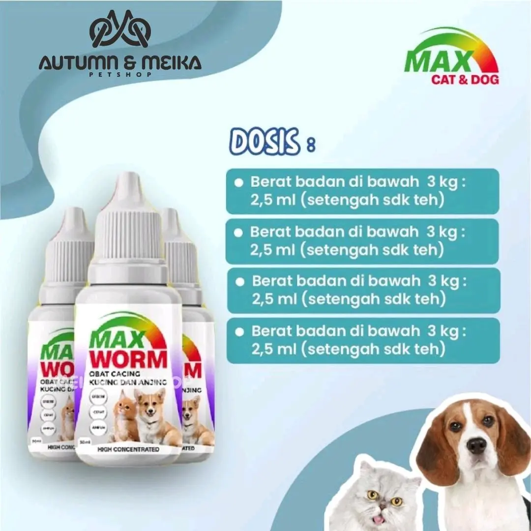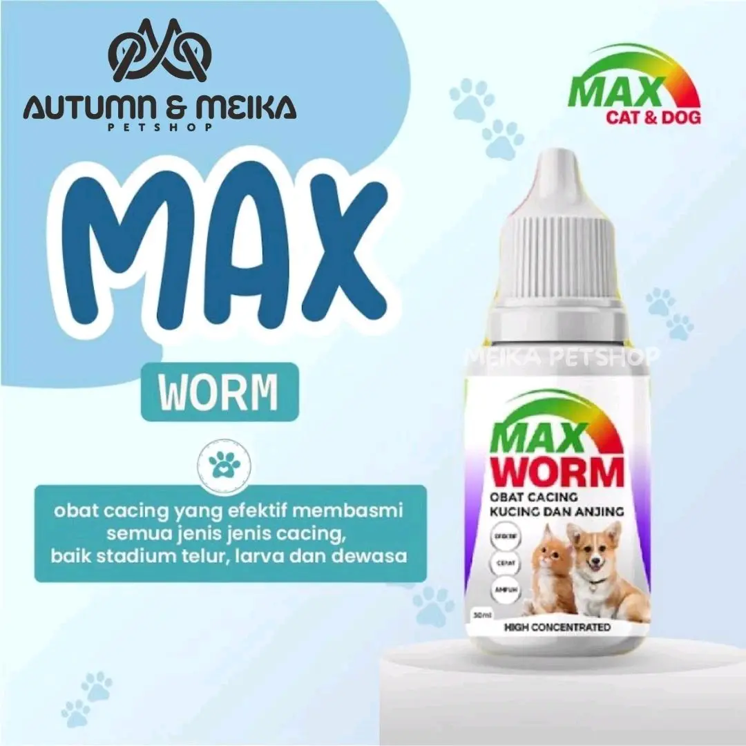 Obat Max Worm merupakan obat cacing yang diperuntukkan bagi kucing dan anjing kecil dan dewasa dengan spektrum luas sehingga membasmi segala jenis cacing, baik stadium telur, larva dan dewasa Indikasi: Efektif membasmi semua jenis dan stadium cacing, mulai dari cacing gelang, pita, tambang, pipih atau cambuk, jantung dan usus (ringworms) Kontra Indikasi: Tidak dianjurkan untuk kucing dan anjing pada usia kehamilan dibawah 45 hari Cara pakai: - Berat badan di bawah 3 kg: 2,5 ml (setengah sdk teh) - Berat badan 4-6 kg: 5ml (1 sdk teh) - Berat badan 7-12 kg : 15 ml (1/2 botol) - Pada kondisi sakit infeksi cacing berat berikan 2 jam sebelum makan selama 3 hari berturut-turut - Pada kondisi sehat untuk pencegahan, diberikan 1-3 bulan sekali tergantung kondisi lingkungan