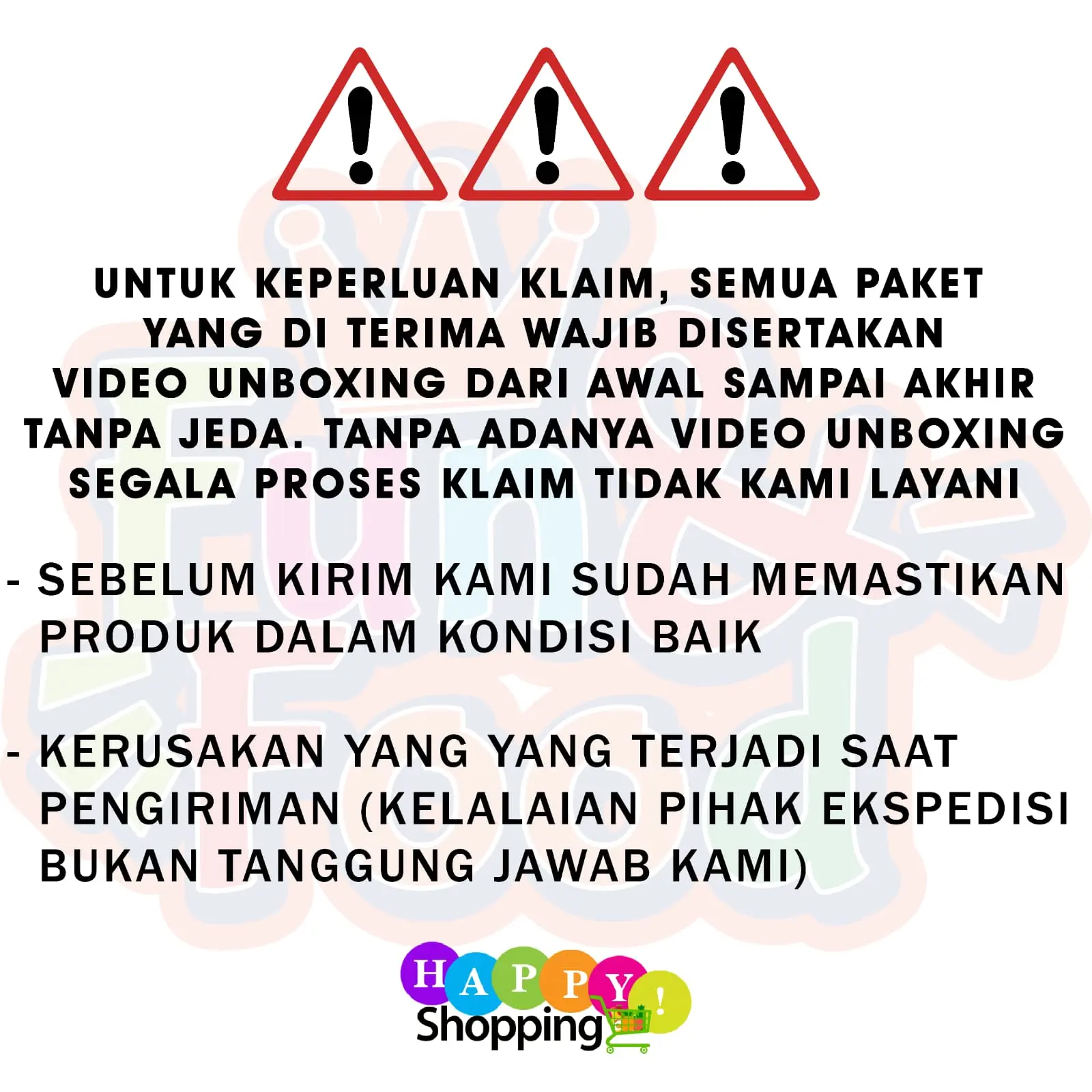 - Wajib membuat video unboxing dari paket terima sebelum dibuka sampai dengan dibuka (untuk keperluan klaim)