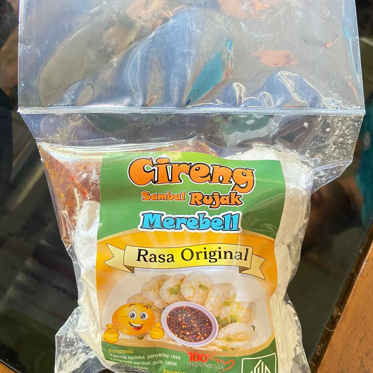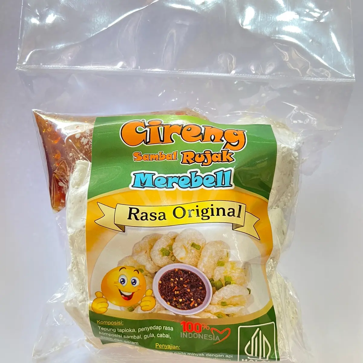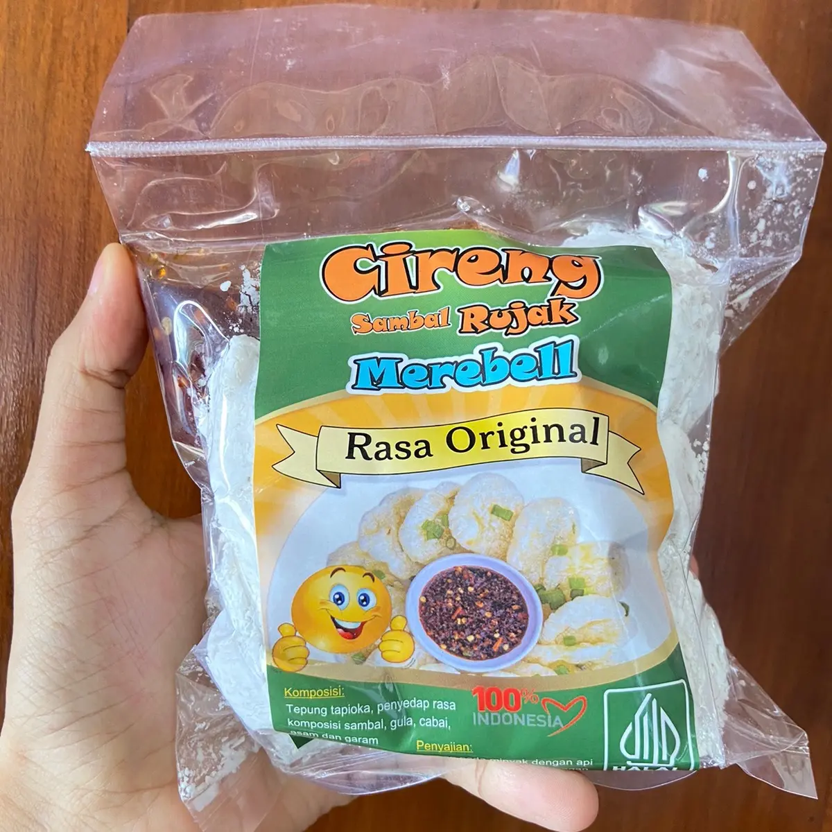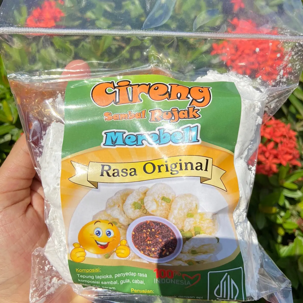 CIRENG SAMBAL RUJAK MEREBELL Rasa : Original Isi : 20Biji Netto : 395gr P-IRT 205330501055928 100% HALAL Komposisi : tepung tapioka, penyedap rasa Komposisi sambal : Gula, Cabai, Asam dan Garam Cara Penyajian : Goreng pada minyak dengan api yang sedang, hidangkan dengan sambal rujak.