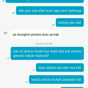 Dan saya chat jawaban gak tepat. Barang nya gak berfungsi. Katanya nunggu proses. Apaan yg di proses karet nya gak narik. Capek jawaban itu2 mulu