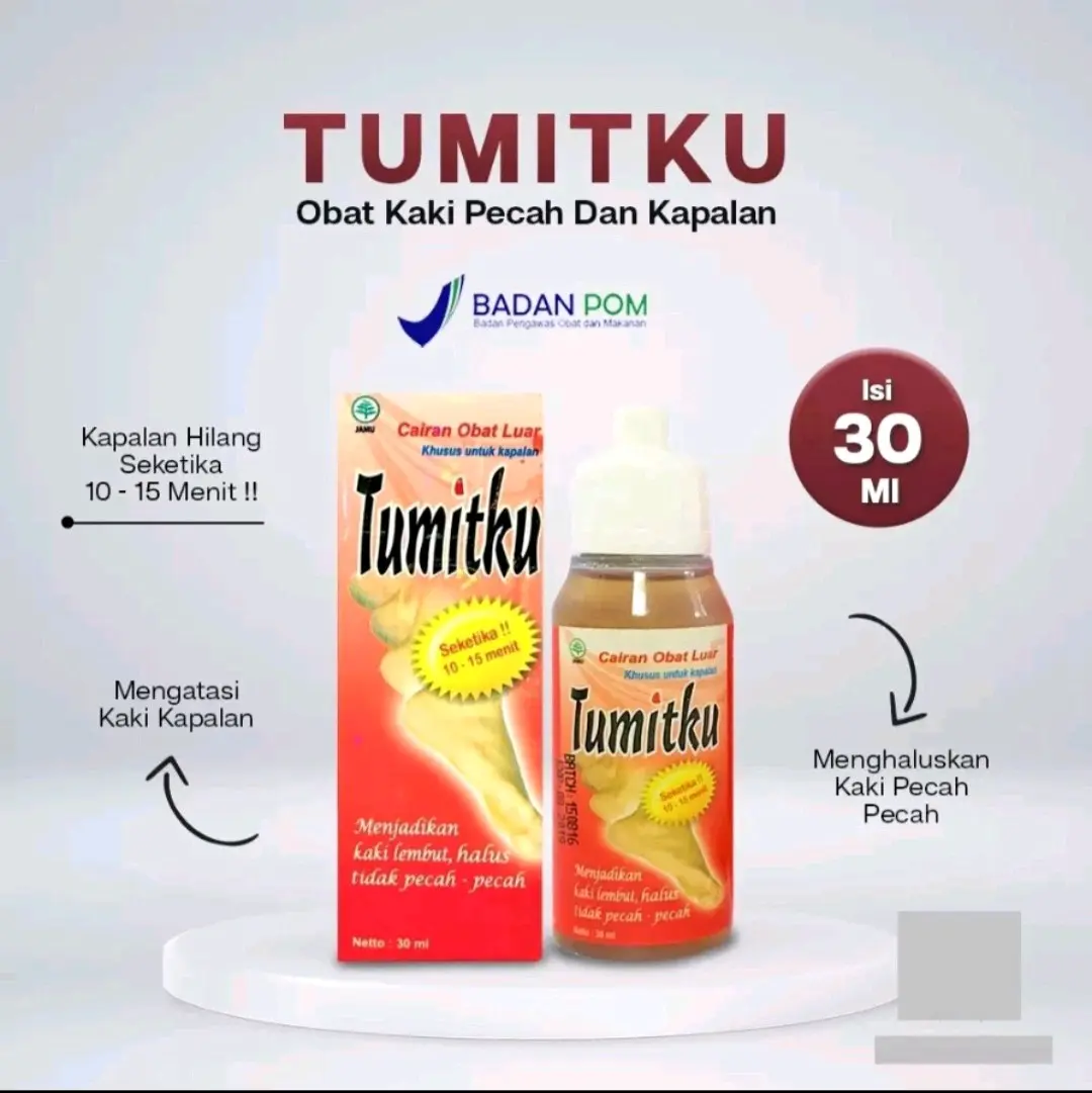 Ingin punya kaki halus dan lembut secara instan? Cobalah TUMITKU 30 ml KAKI KAPALAN AMPUH Bebas Alkohol! Produk yang satu ini dirancang khusus untuk mengatasi masalah kakimu yang kapalan. Dengan penggunaan hanya sekali, hasilnya langsung terlihat!
