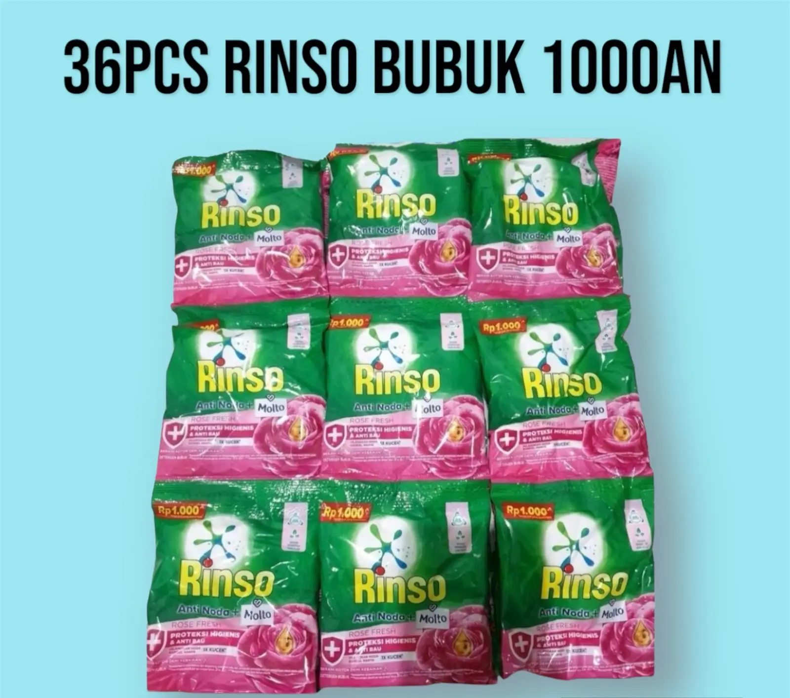 Dapatkan produk deterjen terbaik untuk rumah tangga Anda dengan PROMO 36PCS/6RENCENG RINSO BUBUK 1000AN ISI 38GR JATIM.