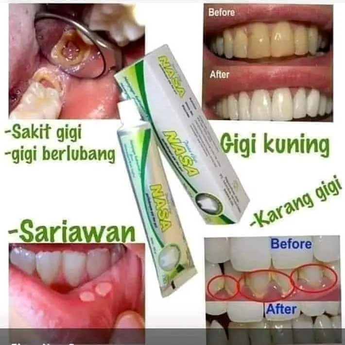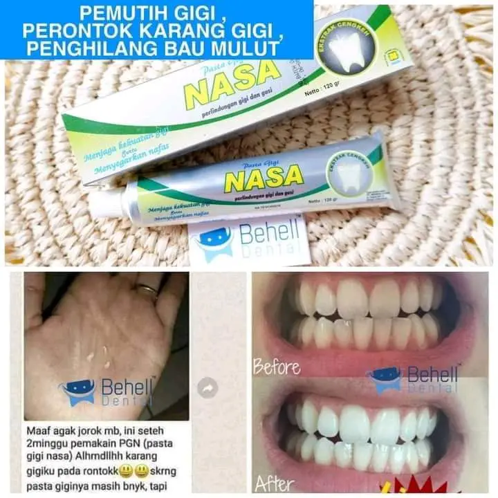 PGN nasa memiliki sifat antiseptik untuk infeksi mulut Pantesan banyak yg cocok,,,,, Alhamdulillah, jadi g'pernah sakit gigi/gusi lagi Bonusnya plus" Nafas segar sepanjang hari Yuuuk,,, ganti pasta gigimu dg pasta gigi NASA Manfaat PGN Mengatasi : Bau mulut Gigi kuning Gigi ngilu Gigi sensitif Karang gigi Gigi sakit Gusi berdarah Bersihnya dapet, sehatnya juga dapet Harga terjangkau dan dapat di gunakan untuk semua umur Yakin g' mau coba??? Yuuk,,, miliki pasta gigi NASA segera
