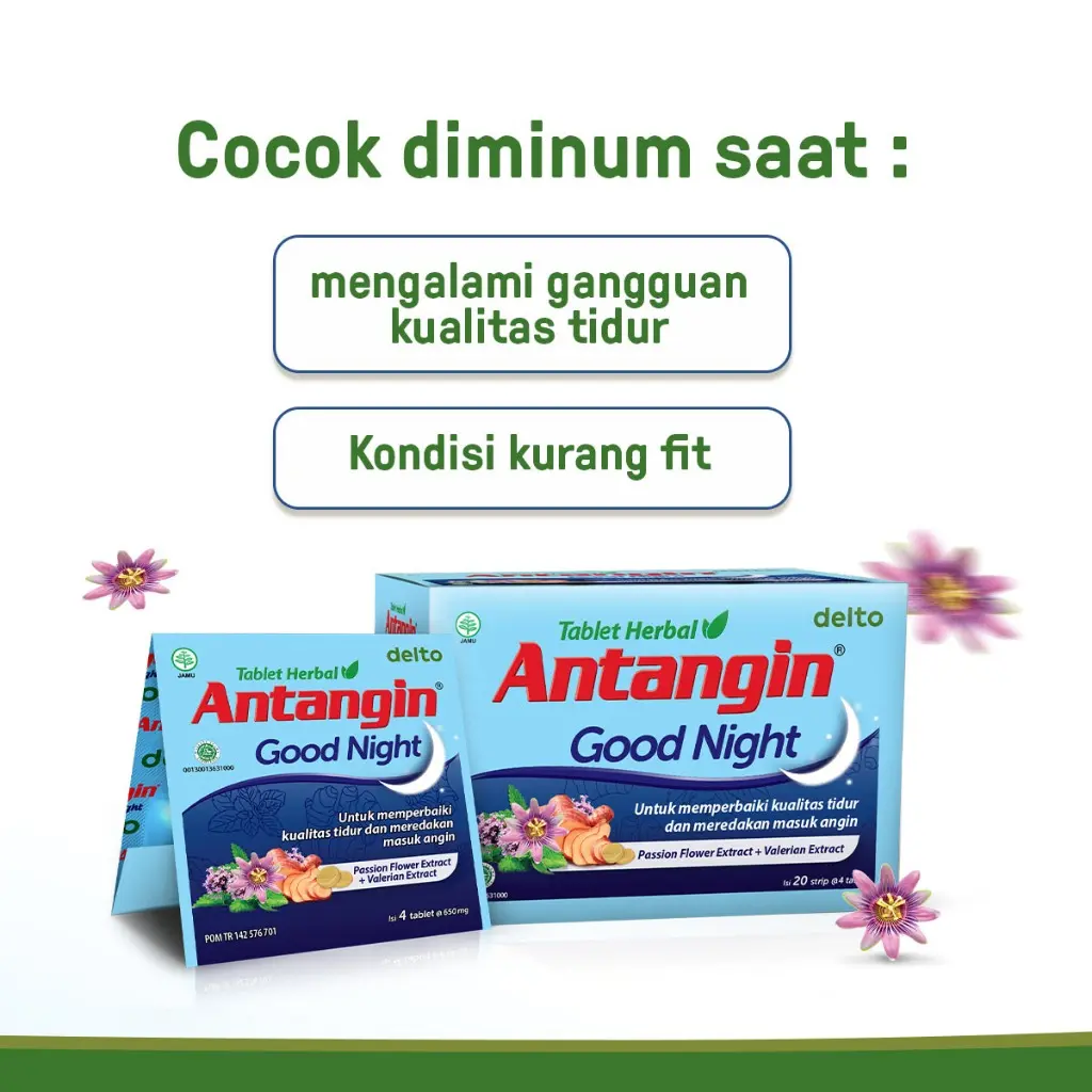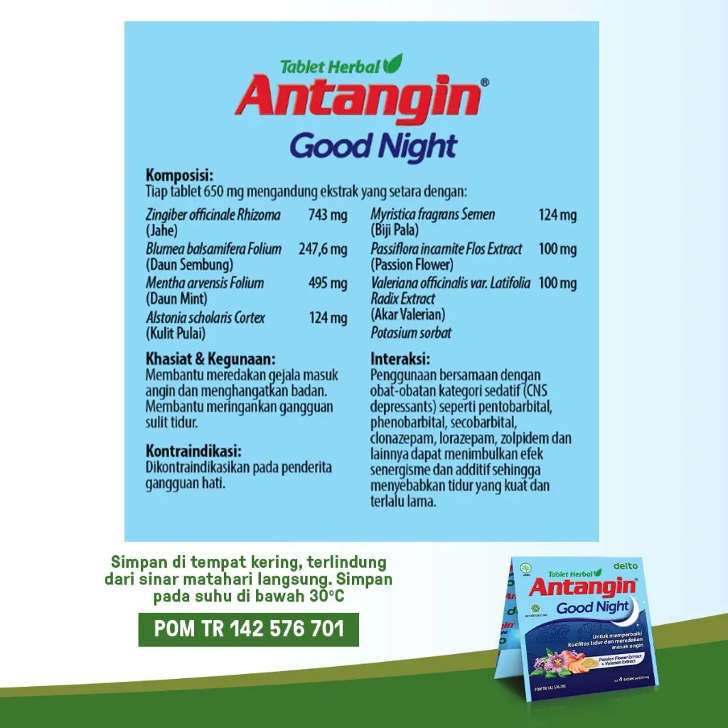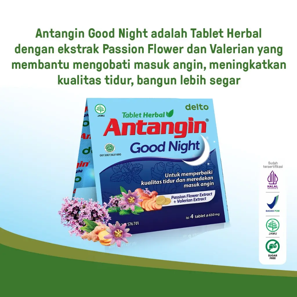 Antangin Good Night Tablet Herbal untuk membantu memperbaiki kualitas tidur dan meredakan masuk angin.