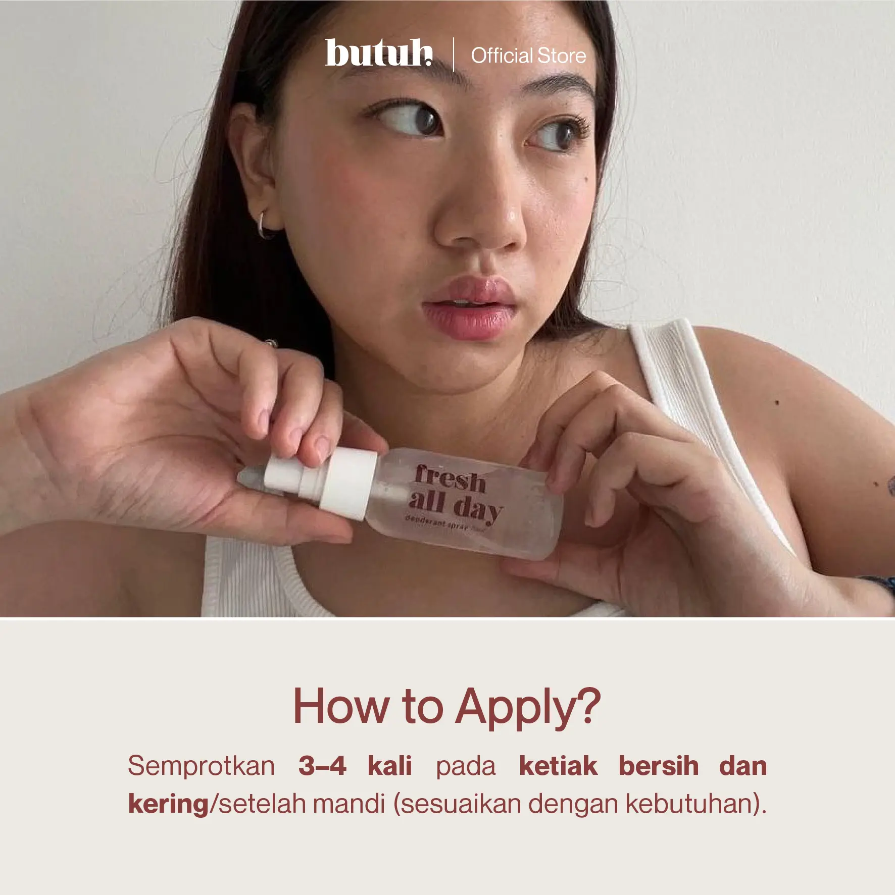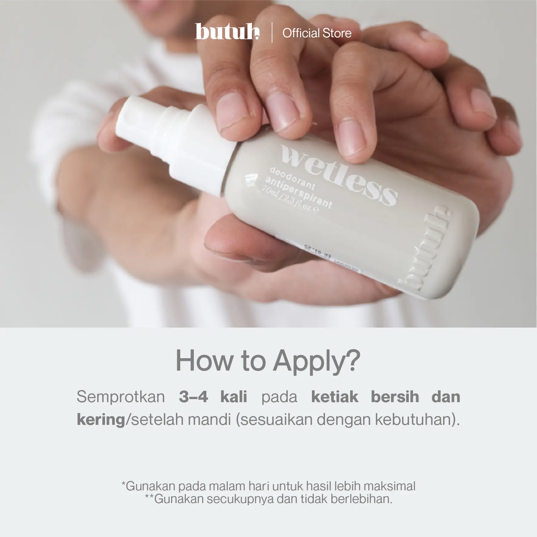 How To Apply: Semprotkan 3 - 4 kali pada ketiak bersih dan kering / setelah mandi (sesuaikan dengan kebutuhan).