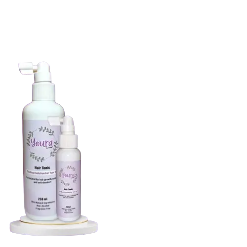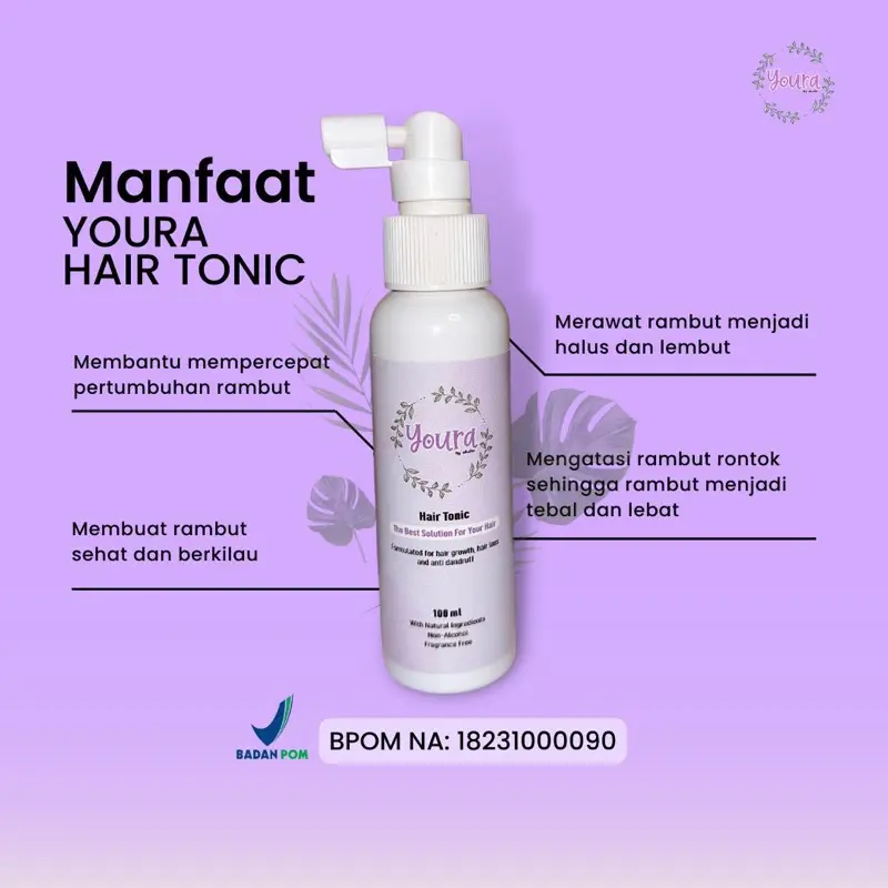 Youra Hair Tonic merupakan perawatan rambut yang mengandung NATURAL Ingredients (mengandung daun jambu biji, gingseng, daun teh, kemiri dan lavender oil) No Alcohol dan Free Fragrance
