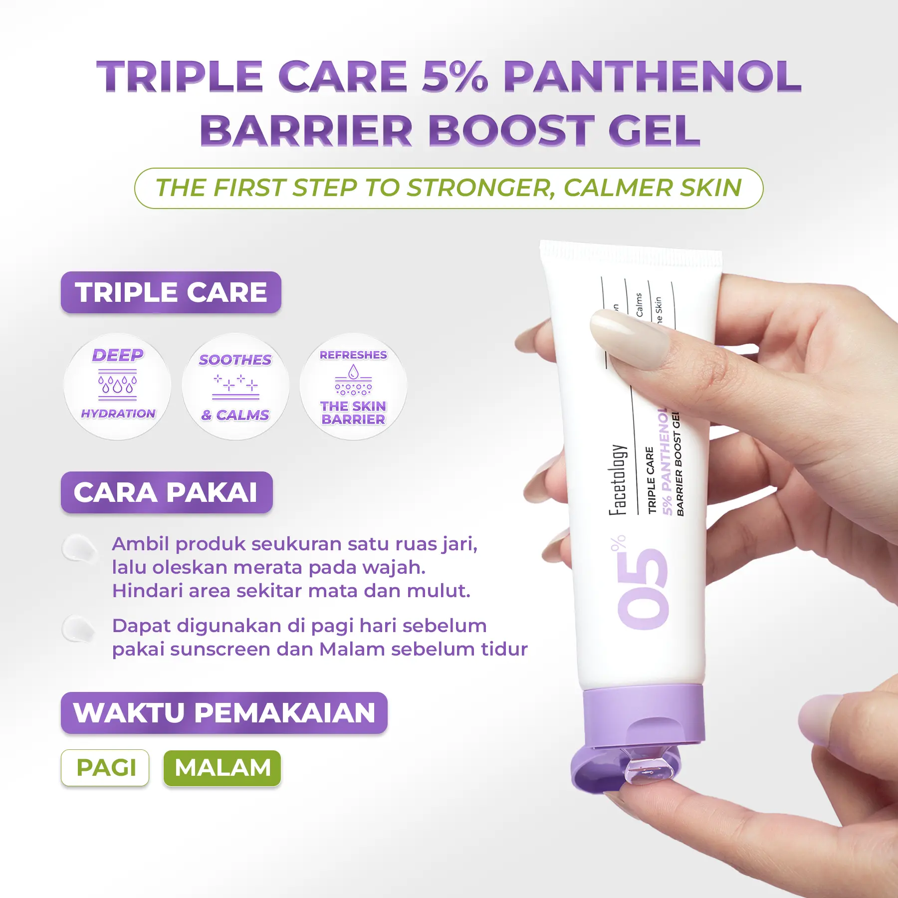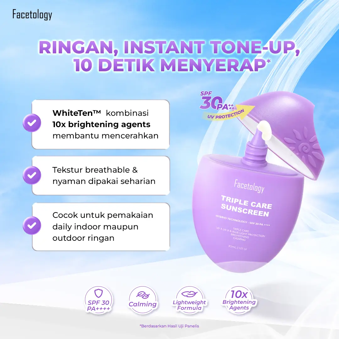 Facetology Triple Care 5% Panthenol ini ringan, cepat meresap, dan nggak lengket. Bantu menenangkan kulit dan menjaga kelembapan. Cocok untuk kulit sensitif, tapi kurang untuk kulit sangat kering.