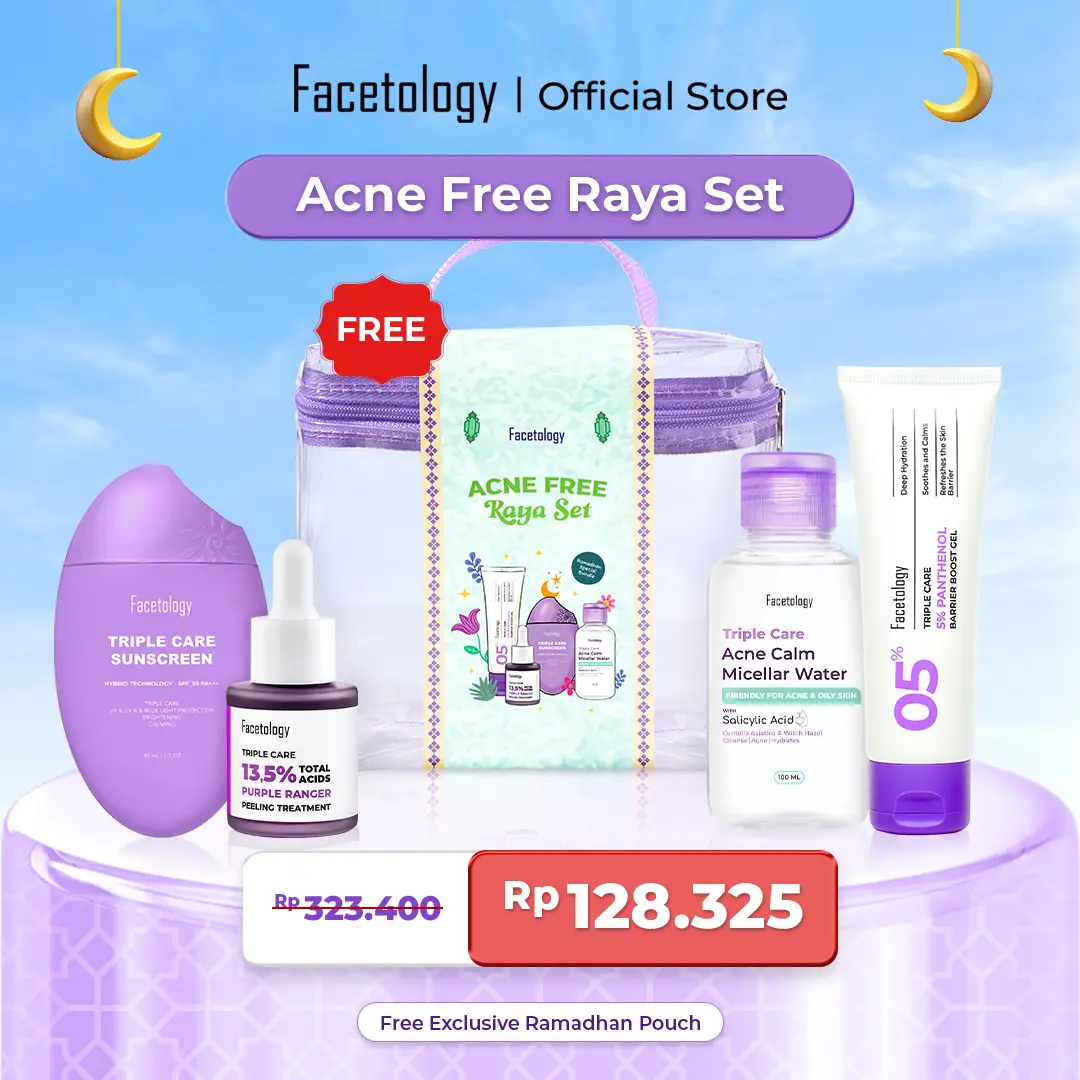 Udah saatnya kamu jadiin momen ramadhan buat glow up tanpa drama jerawat! Acne Free Raya Set dibuat sebagai paket basic routine untuk kulit acne-prone yang butuh calming, protection, dan gentle exfoliation dalam satu bundle yang gak ribet! Perawatan untuk kulit berjerawat dimomen ramadhan maksimal, dan ready to glow-up pas lebaran!