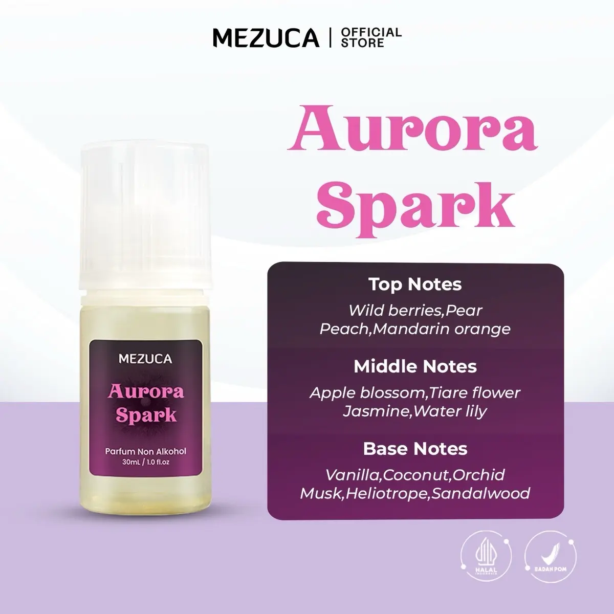 ·Aurora Spark : memiliki aroma yang lembut, feminin, dan elegan, dengan sentuhan manis dan floral yang ringan. Pada bagian atas, terdapat aroma segar dari buah-buahan seperti pear atau citrus, yang memberikan kesan segar, manis, dan cerah.