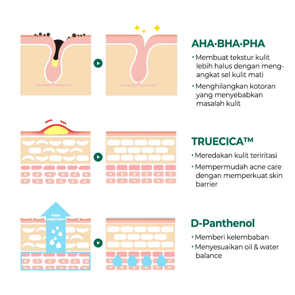 Solusi target jerawat dengan AHA BHA PHA & Truecica & Panthenol