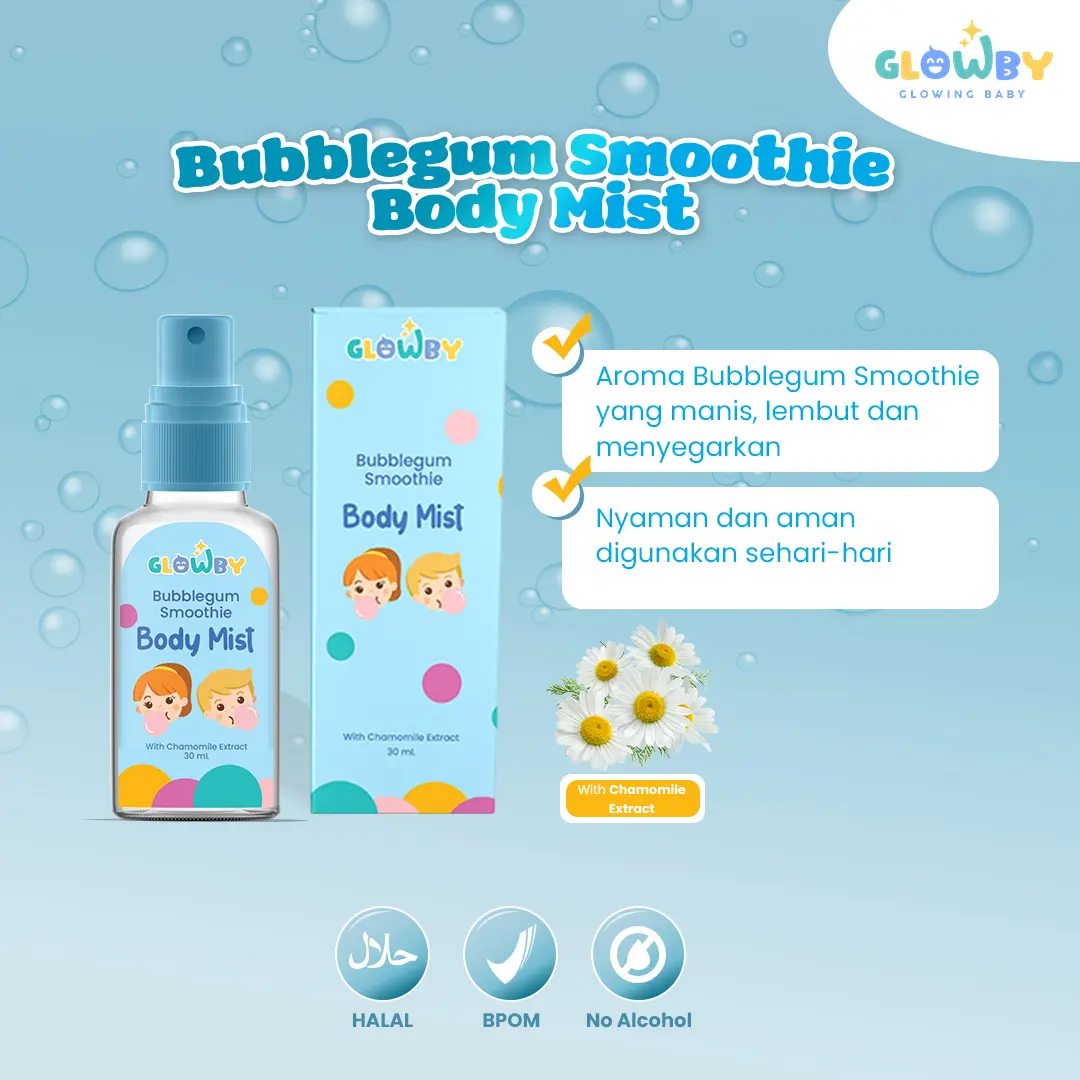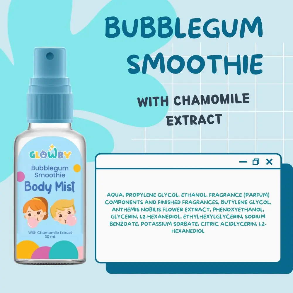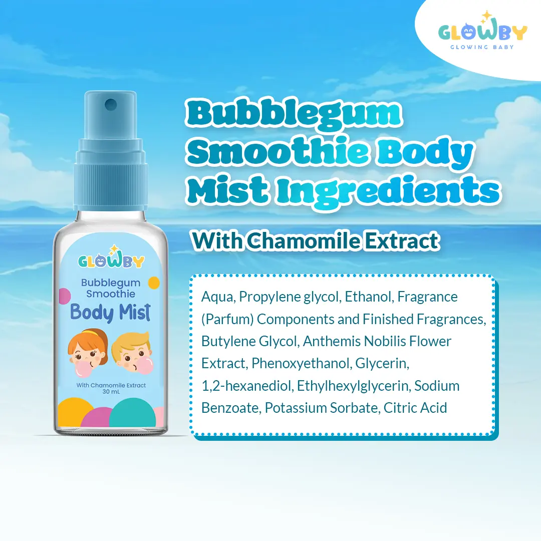 ยทAman untuk bayi dan anak Body Mist Smoothie Bubble Gum Glowby mengandung chamomile extract yang aman digunakan pada kulit bayi maupun anak Anda. Dengan formula lembut tanpa alkohol, menjadikan produk ini aman digunakan sehari-hari.