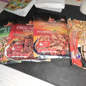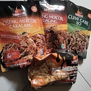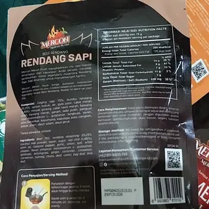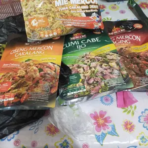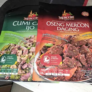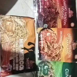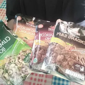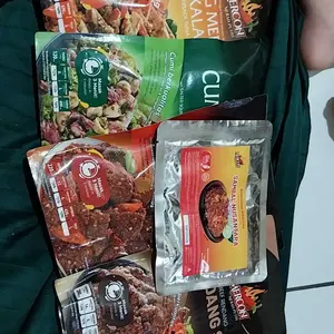 Udh di coba daging nya empuk aku panaskan nya di rebus, rasanya enak pedas sedang, klo cumi dan cakalang blm aku buka sm bonus mie nya jg tapi pastinya enak semua