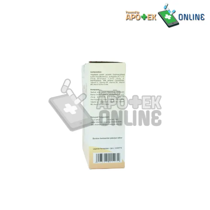 DESKRIPSI LACTO-B merupakan suplemen dengan kandungan probiotik yang membantu fungsi saluran pencernaan NIE SI222035331 KANDUNGAN/KOMPOSISI Tiap sachet mengandung viable cell counts 1 x 107 CFU/g (Lactobacillus acidophilus, Bifidobacterium longun, Streptococcus thermophillus), vitamin C 10 mg, vitamin B1 0.5 mg, vitamin B2 0.5 mg, vitamin B6 0.5 mg, niacin 2 mg, protein 0.02 gram, fat 0.1 gram KONTRAINDIKASI // JANGAN DIGUNAKAN OLEH Hipersensitif terhadap produk probiotik. DOSIS Anak 1-12 tahun : 3 sachet/hari CARA PEMAKAIAN Dapat dikonsumsi langsung dengan melarutkannya bersama air putih atau dikonsumsi bersama makanan untuk mengurangi ketidak-nyamanan pencernaan INDIKASI/ KEGUNAAN Diare dan pencegahan intoleransi laktosa MANUFAKTUR Novell Pharmaceutical Laboratories KEMASAN Sachet 1 gram EFEK SAMPING Hati-hati terhadap penggunaan Lacto-B jika memiliki reaksi alergi terhadap produk probiotik dan segera ke dokter PERHATIAN KHUSUS Hati-hati terhadap penggunaan Lacto-B jika memiliki reaksi alergi terhadap produk probiotik dan segera ke dokter jika muncul gejala dehidrasi, seperti mulut kering, menangis tanpa air mata, buang air kecil berkurang, tampak lemas dan mengantuk, atau rewel. CARA PENYIMPANAN Baik disimpan pada suhu ruangan, jauhkan dari cahaya langsung dan tempat yang lembap. PERLU RESEP Tidak GOLONGAN Vitamin & Suplemen