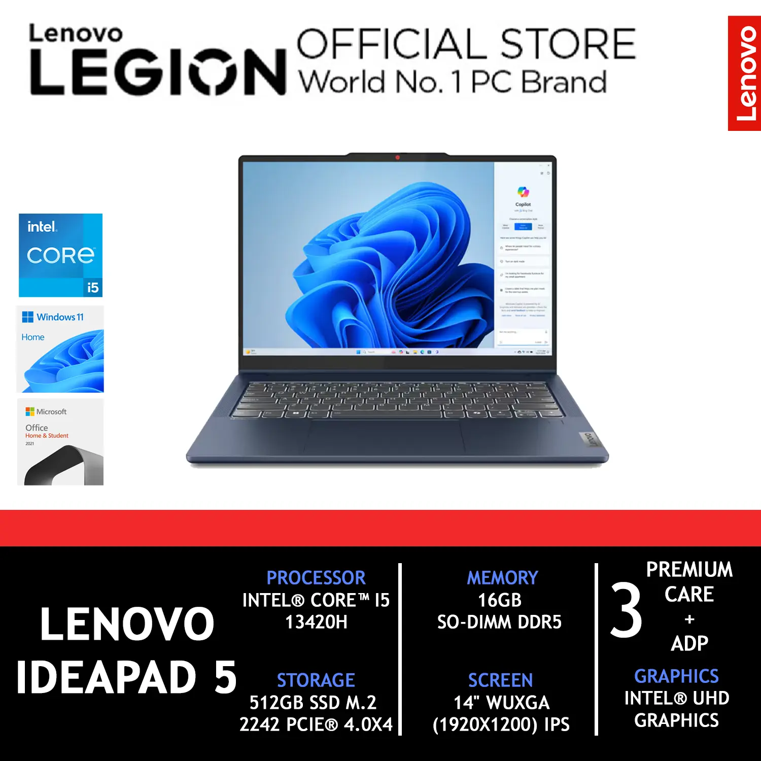 SELAMAT DATANG DI LENOVO LEGION OFFICIAL Part Number : 83KX000YID Part Number : 83KX0010ID LENOVO IDEAPAD 5 2IN1 14 I5 13420H 16GB 512GB W11+OHS 14.0 WUXGA PEN 2Y+2ADP BLUE -0YID LENOVO IDEAPAD 5 2IN1 14 I5 13420H 16GB 512GB W11+OHS 14.0 WUXGA PEN 2Y+2ADP GREY -10ID Processor Intel Core i5-13420H, 8C (4P + 4E) / 12T, P-core 2.1 / 4.6GHz, E-core 1.5 / 3.4GHz, 12MB Graphics Integrated Intel UHD Graphics Chipset Intel SoC Platform Memory 16GB Soldered LPDDR5x-5200 Memory Slots Memory soldered to systemboard, no slots, dual-channel Max Memory 16GB soldered memory, not upgradable Storage 512GB SSD M.2 2242 PCIe 4.0x4 NVMe Storage Support One drive, up to 1TB M.2 2242 SSD Storage Slot One M.2 2242 PCIe 4.0 x4 slot Card Reader microSD Card Reader Optical None Audio Chip High Definition (HD) Audio, Realtek ALC3287 codec Speakers Stereo speakers, 2W x2, optimized with Dolby Audio Camera FHD 1080p with Privacy Shutter Microphone 2x, Array Battery Integrated 57Wh Power Adapter 65W USB-C (3-pin) Display 14 #34; WUXGA (1920x1200) IPS 300nits Glossy, 45% NTSC, 60Hz, TÜV Low Blue Light, Glass, Touch Touchscreen 10-point Multi-touch Color Calibration None Keyboard Backlit, English Touchpad Buttonless Mylar surface multi-touch touchpad, supports Precision TouchPad (PTP), 75 x 120 mm (2.95 x 4.72 inches) Case Color Cosmic Blue Surface Treatment Aluminium Stamping (Anodized with Sandblasting) Case Material Aluminium (Top), PC-ABS + 40% GF (Bottom) Pen Lenovo Digital Pen 2 Dimensions (WxDxH) 313 x 227 x 17.5 mm (12.32 x 8.94 x 0.69 inches) Weight Starting at 1.6 kg (3.53 lbs) SOFTWARE Operating System Windows 11 Home Single Language, English Bundled Software Office Home amp; Student 2021 Ethernet No Onboard Ethernet WLAN + Bluetooth Wi-Fi 6, 802.11ax 2x2 + BT5.2 Standard Ports 1x USB-A (USB 5Gbps / USB 3.2 Gen 1) 1x USB-A (USB 5Gbps / USB 3.2 Gen 1), Always On 2x USB-C (USB 10Gbps / USB 3.2 Gen 2), with USB PD 3.1 and DisplayPort 1.4 1x HDMI 1.4b 1x Headphone / microphone combo jack (3.5mm) 1x microSD card reader Varian: LAPTOP : Sudah fullset (dus laptop + unit laptop + charger + buku panduan + garansi dll) ANTIGORES : LAPTOP Dengan Tambahan Paket Yang Sudah Free Pemasangan Langsung gt; Casing + Screen + Clean Kit AKSESORIES : LAPTOP Dengan Tambahan Paket Mouse Wireless + Mousepad + Softcase Sleeve Case Carbon LENGKAP (ANTIGORES + AKSESORIS) : LAPTOP Dengan Tambahan Paket Yang Sudah Free Pemasangan Langsung gt; Casing + Screen + Clean Kit + Mouse Wireless + Mousepad + Softcase Sleeve Case Carbon SOFTWARE : LAPTOP dengan tambahan UPGRADE langsung ke WINDOWS 11 PRO Garansi Resmi Lenovo Indonesia 2 Tahun