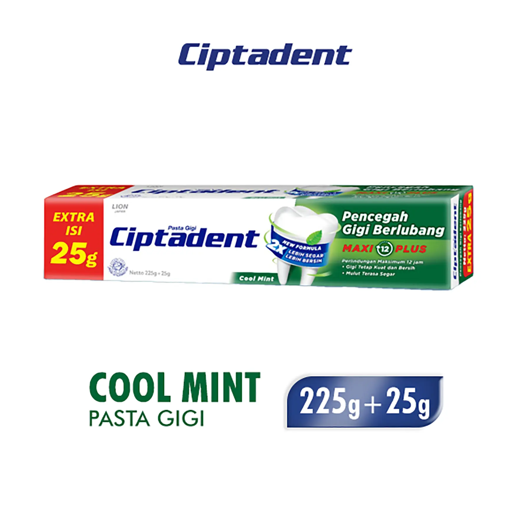 Ciptadent Pasta Gigi Maxi Jumbo Cool Mint 225g+25g Perlindungan Gigi 12 Jam dengan Pro Xylitol Complex dan Natural Calcium - Gusi, Mulut