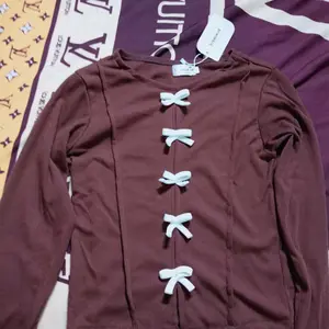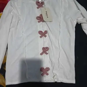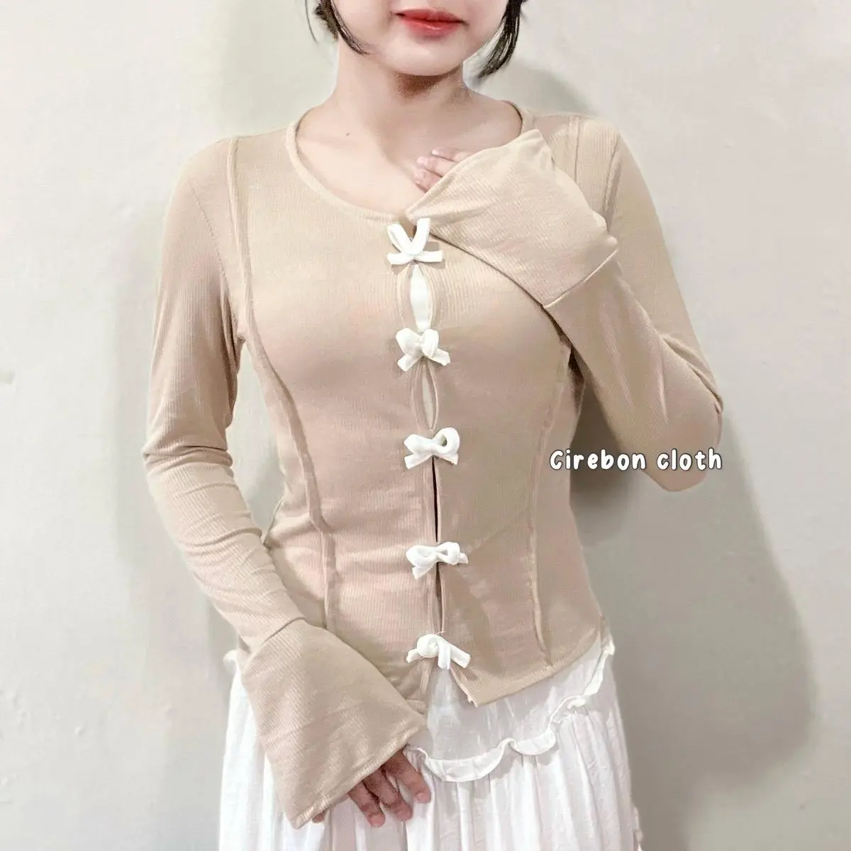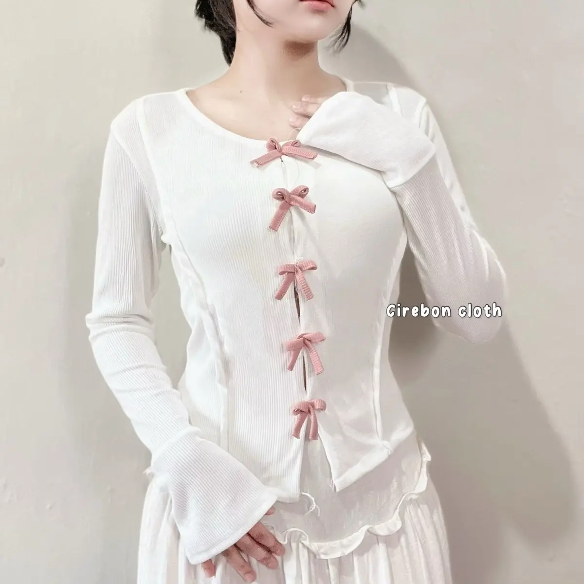 Tampil manis dan anggun dalam satu sentuhan! Blouse lengan panjang dari Cirebon Cloth ini hadir dengan desain feminin yang dihiasi lima pita putih di bagian depan, membuatmu tampak chic dan unik. Terbuat dari bahan rib knit yang lembut dan elastis, nyaman dipakai seharian baik untuk aktivitas indoor maupun outdoor.