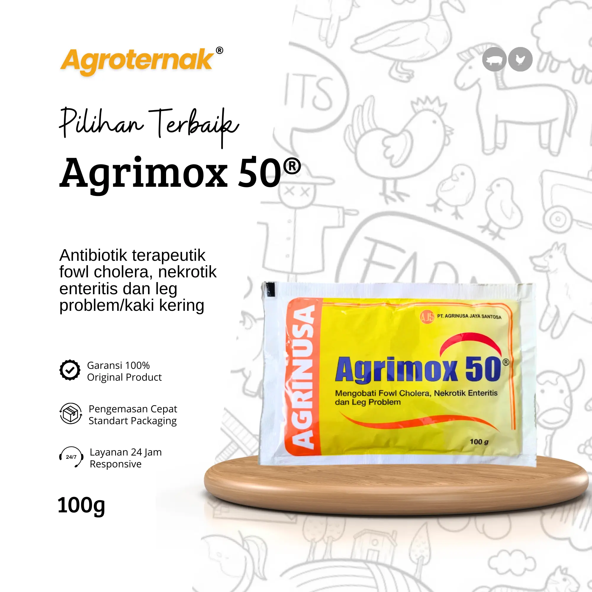 Agrimox-50 adalah class antibiotik Beta-laktam dan Polipeptide untuk pengobatan Cholera, Necrotic enteritis dan Leg problem (kaki kering). Antibiotik spektrum luas yang efektif melawan infeksi yang disebabkan oleh bakteri gram positif dan beberapa bakteri gram negatif.