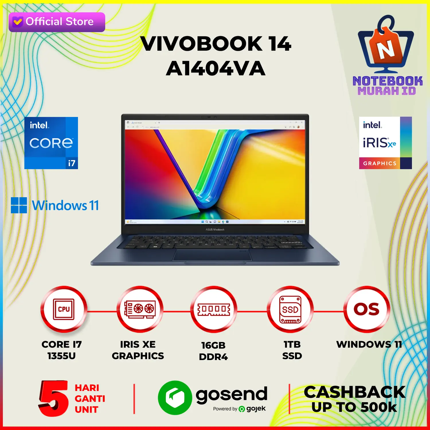 Selamat Datang di OFFICIAL STORE NOTEBOOK MURAH ID ***Chat Admin Terlebih Dahulu Untuk Memastikan Ketersediaan Stock*** Jangan Lupa Lindungi Laptop Kamu Dengan : Paket Anti Gores : Screen Protector + Laminating Body + Cleaning Kit Paket Aksesoris : Mouse Wireless + Mouse Pad + Sleevecase Paket Lengkap : Paket Anti Gores + Paket Aksesoris ================================================================== DETAIL SPECIFICATION : ASUS VIVOBOOK 14 A1404VA I7 1355 16GB 1TB W11+OHS 2021+M365 14.0FHD VIPS BLU -VIPS711M ASUS VIVOBOOK 14 A1404VA I7 1355 16GB 1TB W11+OHS 2021+M365 14.0FHD VIPS SLV -VIPS712M • Processor : Intel Core i7-1355U Processor 1.7 GHz (12MB Cache, up to 5.0 GHz, 10 cores, 12 Threads) • Memory : DDR4 16GB • Storage : 1TB M.2 NVMe PCIe 4.0 SSD • Graphics : Integrated Intel Iris Xe Graphics Functions as UHD Graphics • Display : 14.0-inch FHD (1920 x 1080) 16:9 aspect ratio LED Backlit IPS-level Panel 60Hz refresh rate 250nits 100% sRGB color gamut Anti-glare display • I/O Ports : 1x USB 2.0 Type-A 1x USB 3.2 Gen 1 Type-C 2x USB 3.2 Gen 1 Type-A 1x HDMI 1.4 1x DC-in • Keyboard & Touchpad : Backlit Chiclet Keyboard, 1.4mm Key-travel, Precision Touchpad, Support NumberPad • Camera : 720p HD camera With privacy shutter • Audio : SonicMaster Built-in speaker Built-in array microphone with Cortana voice-recognition support • Network and Communication : Wi-Fi 6E(802.11ax) (Dual band) 1*1 + Bluetooth 5.3 Wireless Card • Battery : 42WHrs, 3S1P, 3-cell Li-ion • Power Supply : ø4.5, 45W AC Adapter, Output: 19V DC, 2.37A, 45W, Input: 100~240V AC 50/60Hz universal • Weight : 1.40 kg (3.09 lbs) • Dimensions (W x D x H) : 32.49 x 21.39 x 1.79 ~ 1.79 cm (12.79" x 8.42" x 0.70" ~ 0.70") • ASUS Exclusive technology : ASUS Antimicrobial Guard Plus • Operating System : Windows 11 Home • Microsoft Office : Microsoft Office Home & Student 2021 • Military Grade : US MIL-STD 810H Garansi Resmi 2 Tahun Garansi Toko 5 Hari (tukar unit yang diakibatkan cacat pabrik) Silahkan pesan paket antigores agar kami pasang sebelum kirim ================================================================== Keuntungan Order Di Notebook Murah Id : Include asuransi pengiriman keseluruh Indonesia Fast Response Siap melayani untuk pengadaan Melewati proses QC dan bergaransi