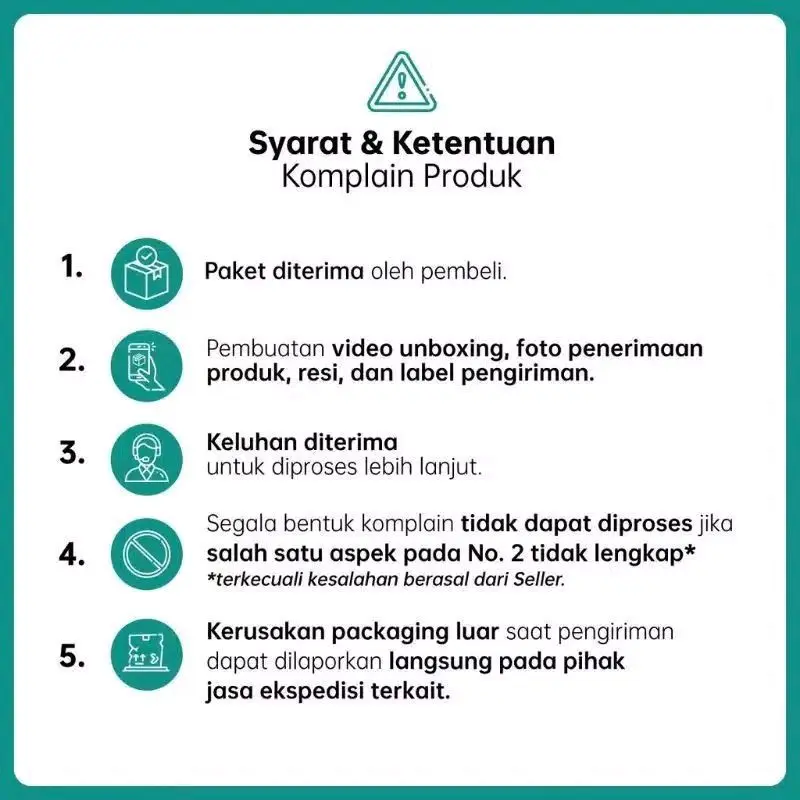 4.Segala bentuk komplain tidak dapat di proses jika aspek No.2 tidak lengkap *terkecuali kesalahan berasal dari seller*