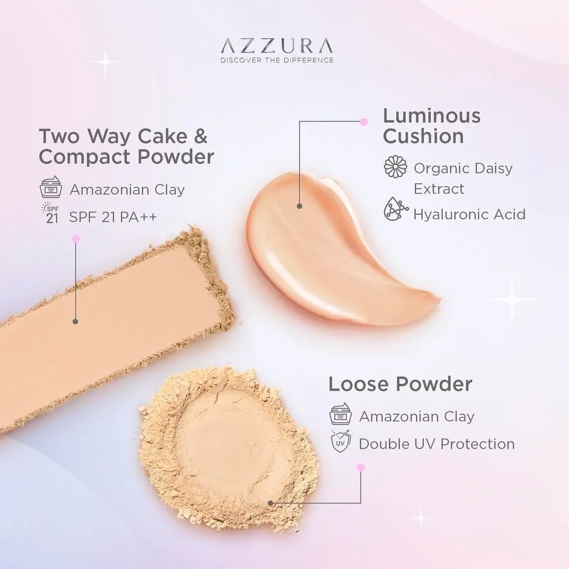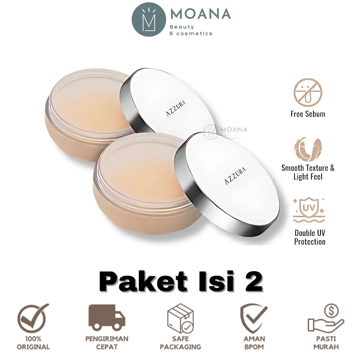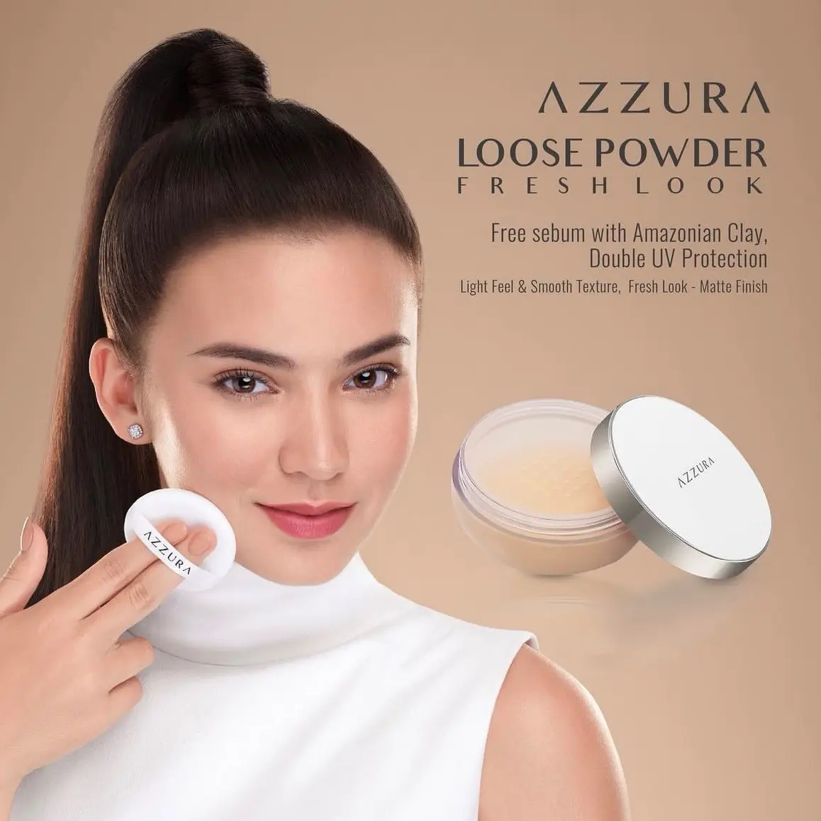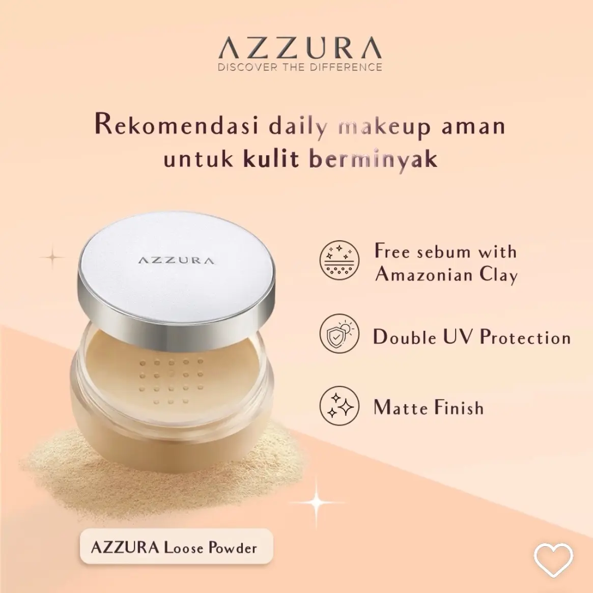 AZZURA Loose Powder adalah bedak tabur yang memiliki tekstur ringan dan halus. Bedak ini mengandung Amazonian Clay yang dapat mengendalikan minyak berlebih pada wajah sehingga wajah tetap matte dan segar. Selain itu, bedak ini juga dilengkapi dengan Double UV Protection yang melindungi kulit dari paparan UV-A dan UV-B sehingga kulit tetap terlindungi dan terhindar dari kerusakan akibat paparan sinar matahari.