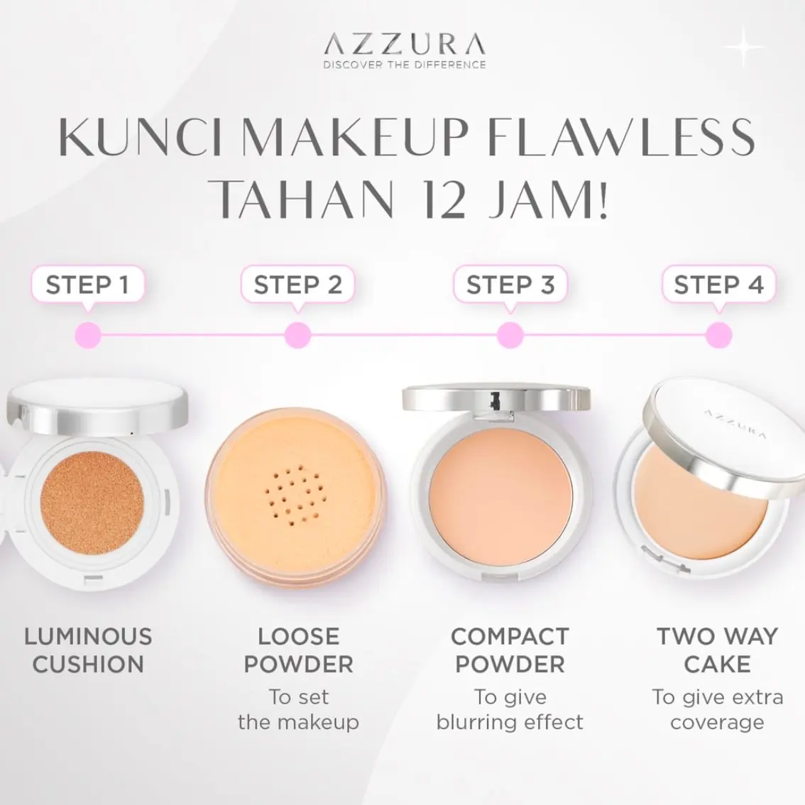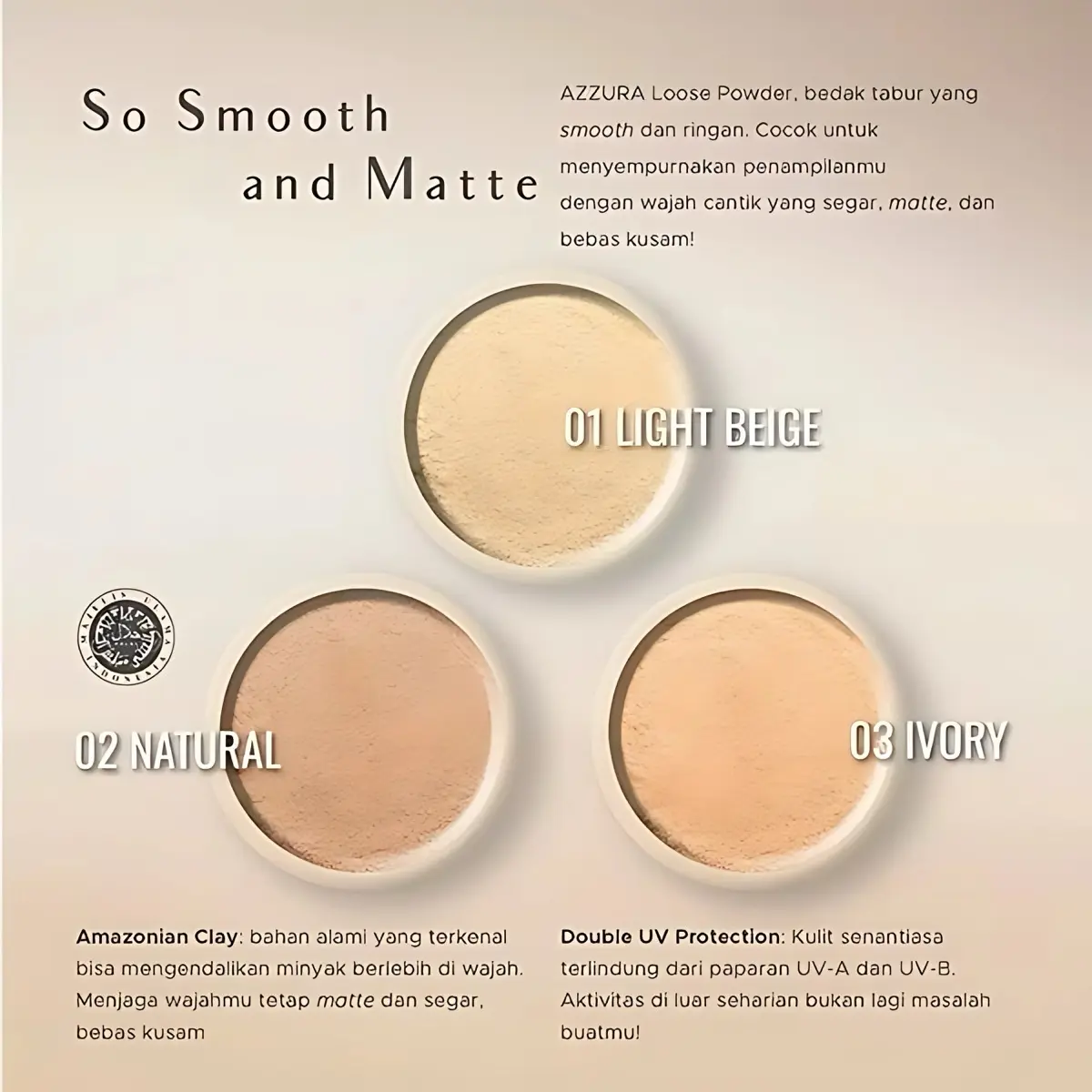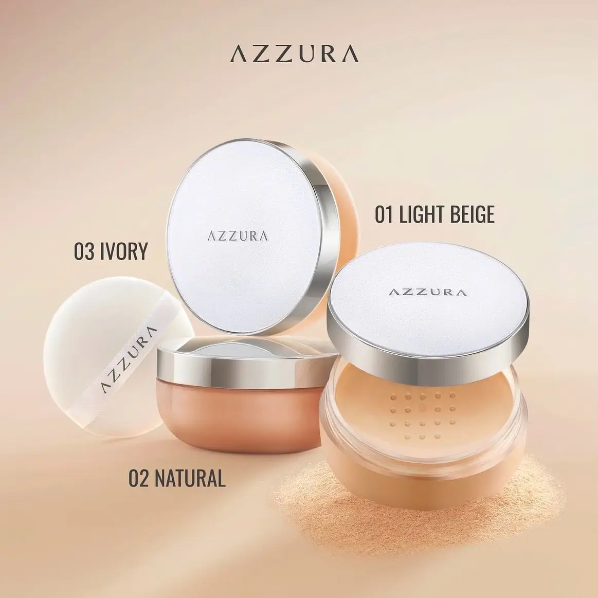 AZZURA Loose Powder tersedia dalam tiga pilihan warna yaitu 01 Light Beige, 02 Natural, dan 03 Ivory. Bedak ini juga sudah non-comedogenic sehingga aman digunakan untuk kulit yang sensitif dan tidak akan menyumbat pori-pori kulit.