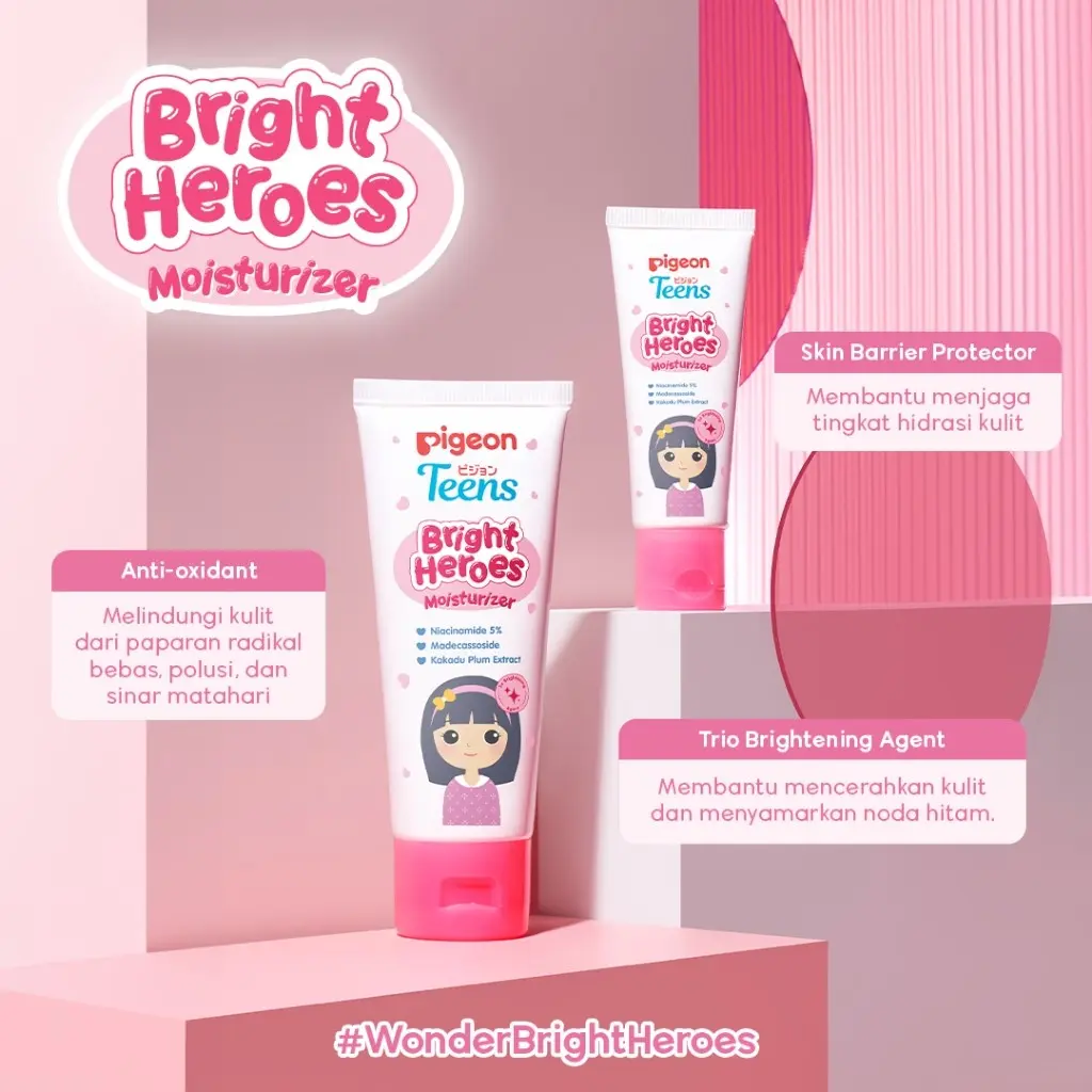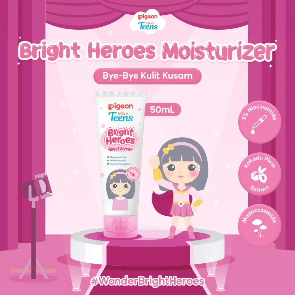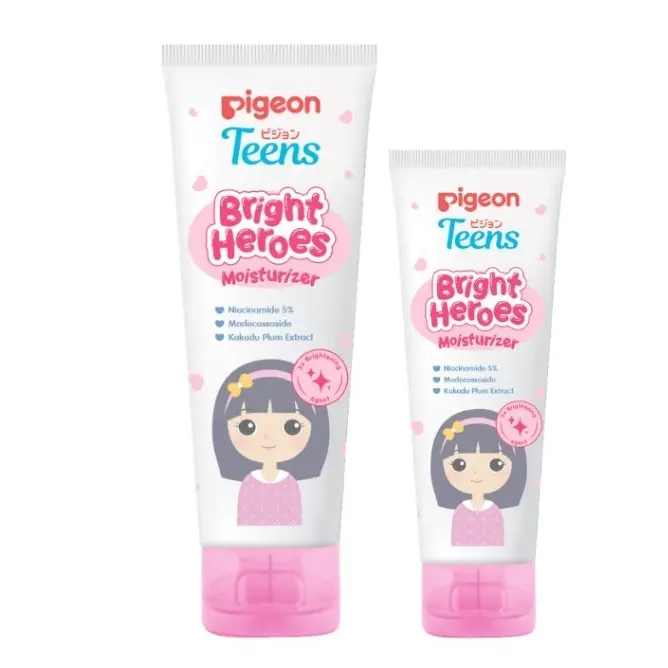 Pigeon Teens Bright Heroes Moisturizer adalah pelembap khusus untuk remaja yang hadir dalam ukuran 60ml dan 20ml. Diformulasikan dengan Niacinamide 5%, produk ini memberikan perlindungan optimal pada kulit remaja.