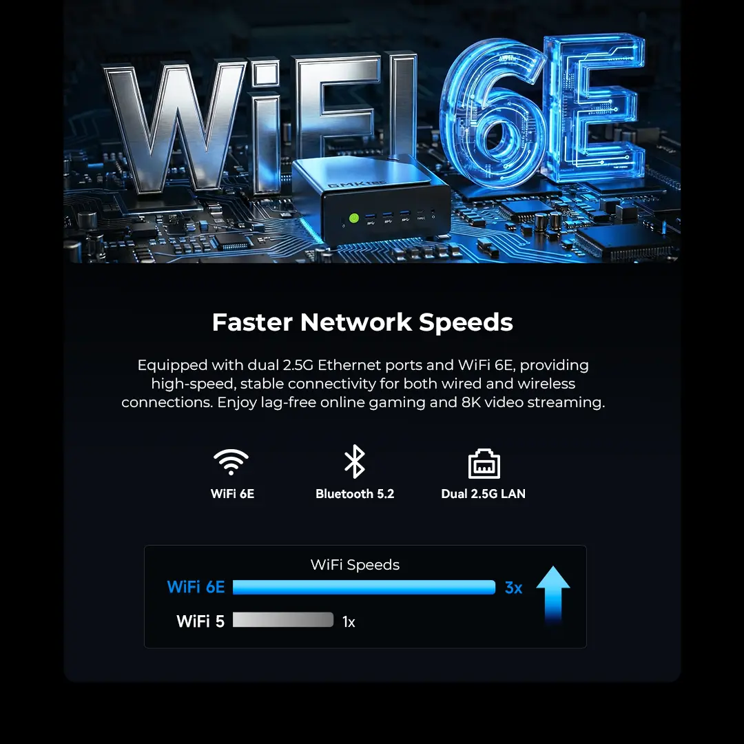 INTERNET : WiFi 6E (MediaTek MT7922, RZ616), Bluetooth 5.2, Dual 2.5G LAN (Realtek 8125BG)