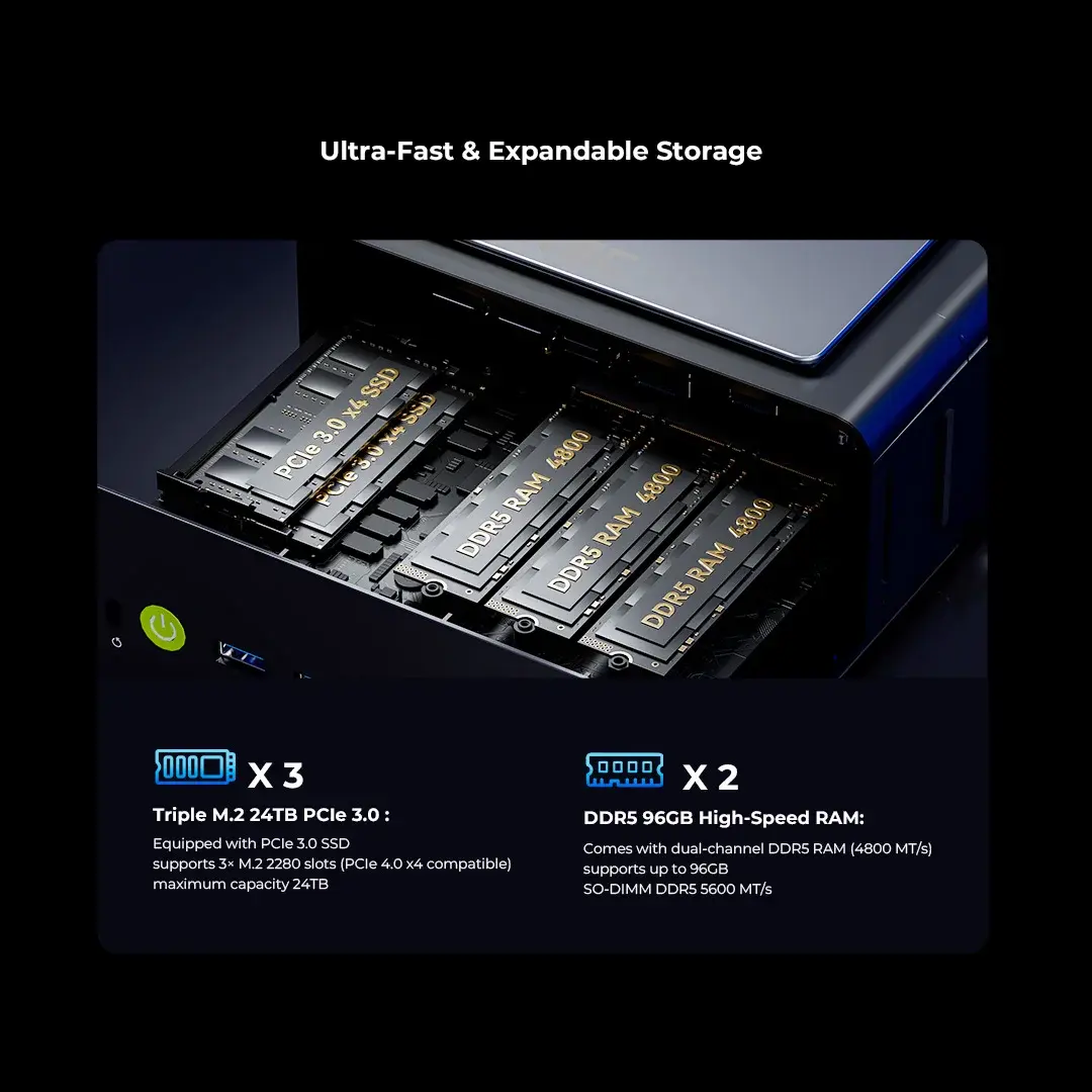 SLOT 2 : Up to 3×M.2 2280 PCIe 4.0×4 SSD slots, max 8TB per slot (total up to 24TB); one slot supports SATA SSD
