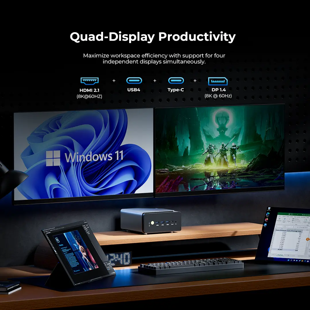DISPLAY : 4 Display Output,HDMI 2.1 ×1 + DP 1.4 ×1 + USB4 ×1 + Type-C ×1, supports simultaneous quad display output