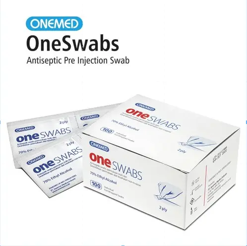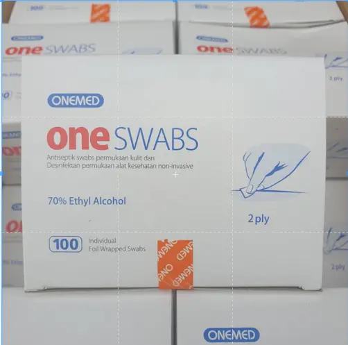 Alcohol / Alkohol Swabs bernama One Swabs, merk asli OneMed. Tissue non woven 2ply steril yang mengandung ethyl alcohol 70%. Digunakan sebagai antiseptik pre injeksi, pemasangan IV, pengambilan darah, melepas jahitan, atau tindakan lainnya yang memerlukan antisepsi. Aman dan dapat juga digunakan untuk membersihkan gadget, peralatan elektronik lainnya. Alat kesehatan digitalmu juga boleh dibersihkan menggunakan tisu alkohol ini, seperti tensi digital, thermometer digital dan lainnya.