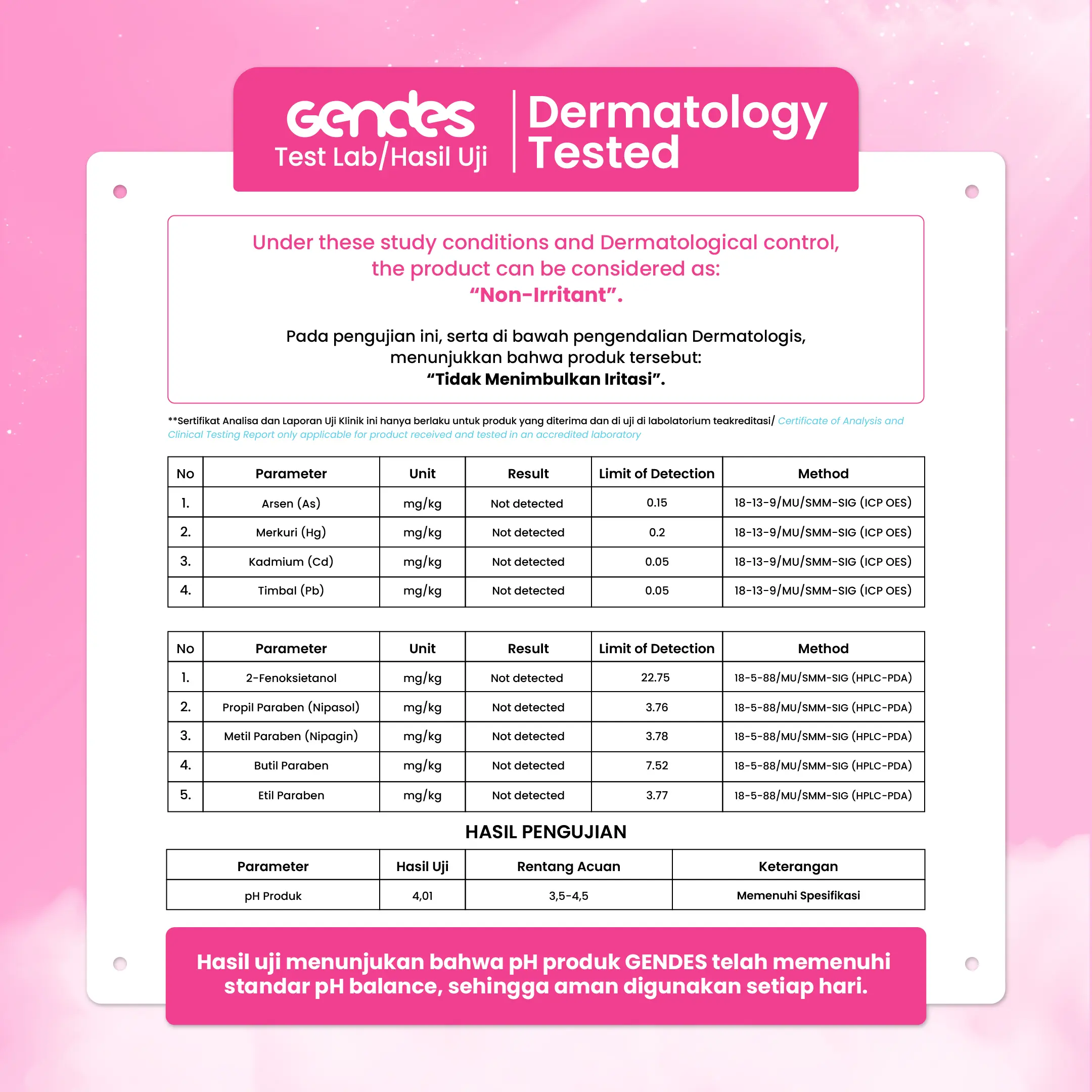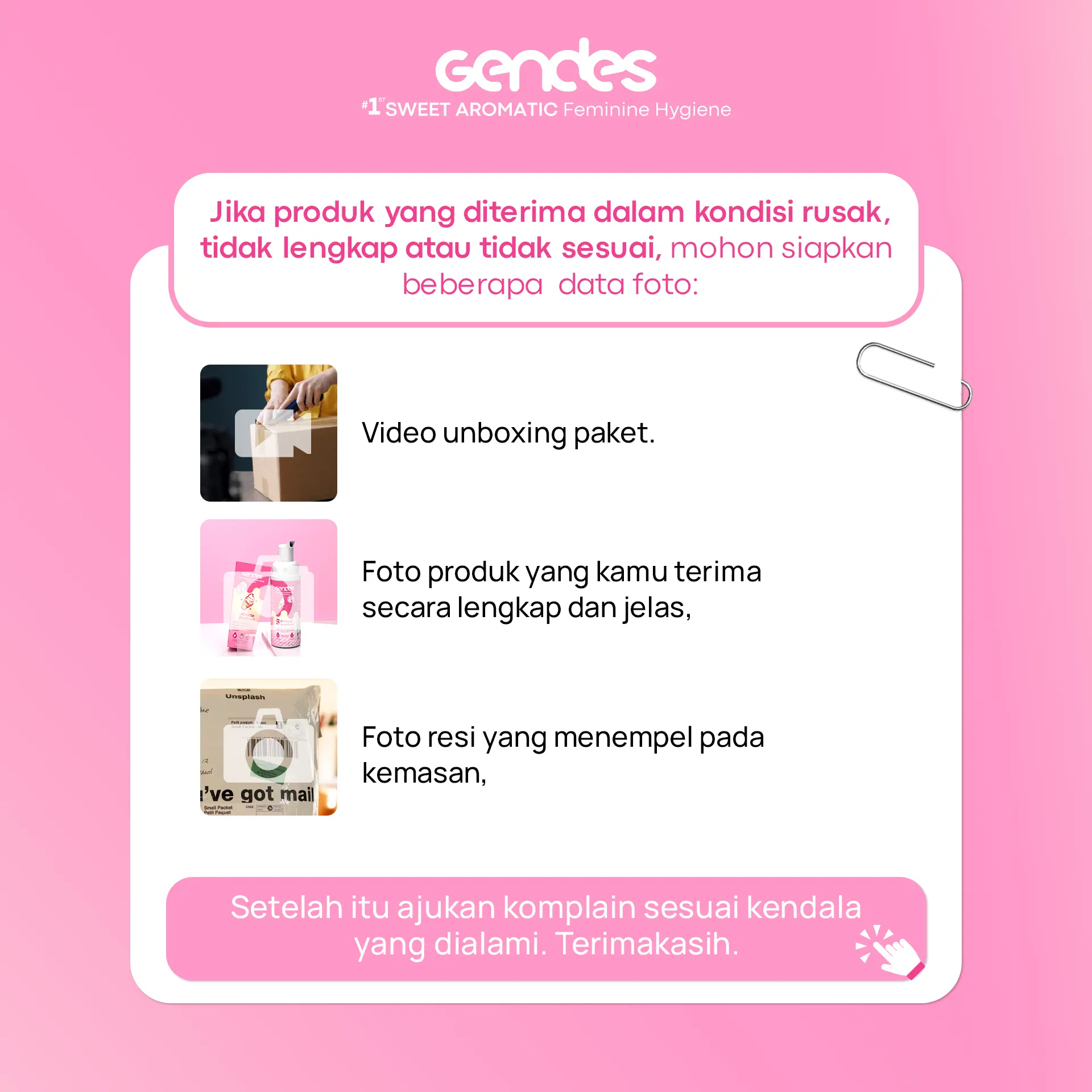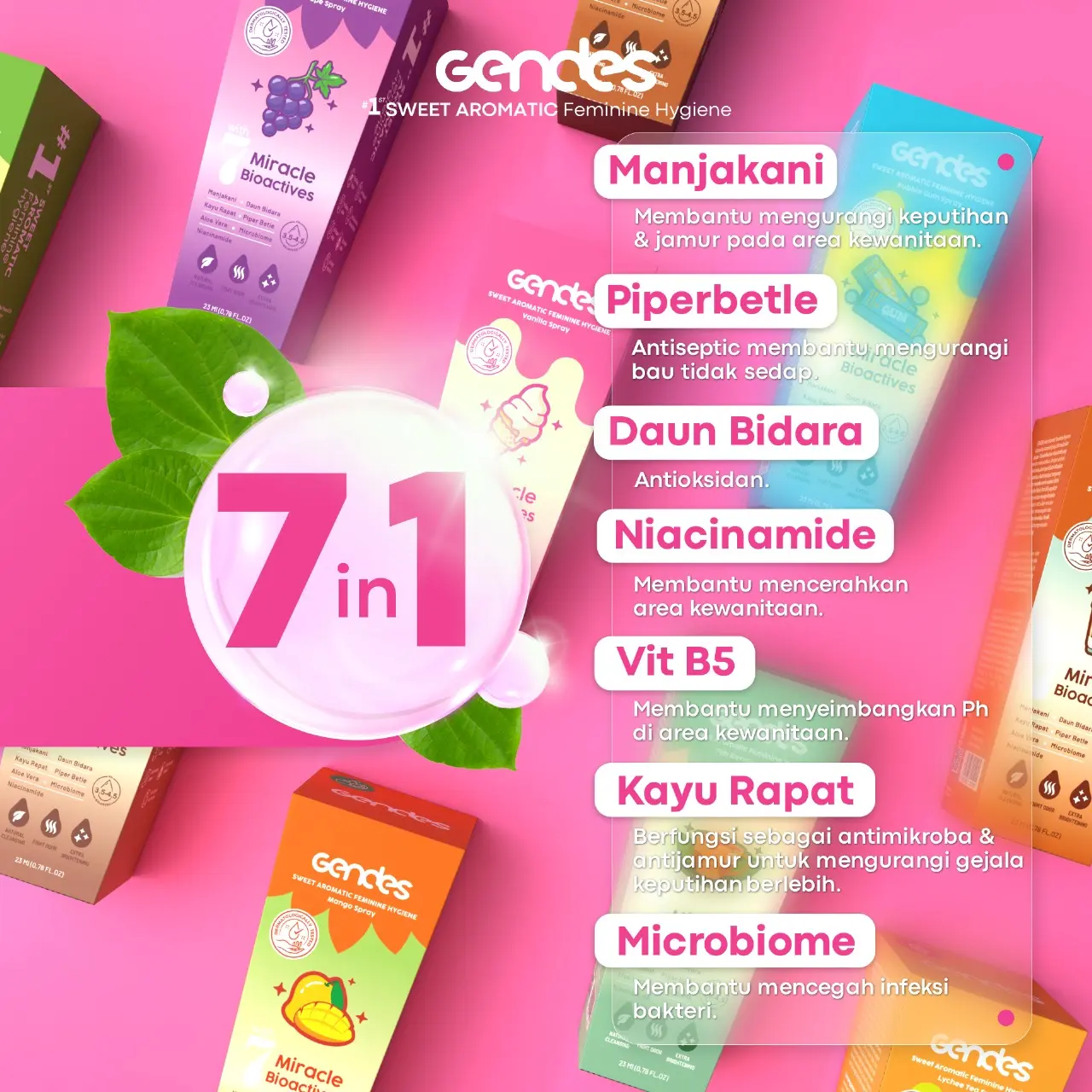 Gendes Feminine Care Spray dengan “7 Miracle Bioactives” yang bekerja sebagai perlindungan ekstra setelah membersihkan area kewanitaan dengan aroma manis yang aman untuk kulit sensitif, dan diformulasi khusus untuk area kewanitaan.