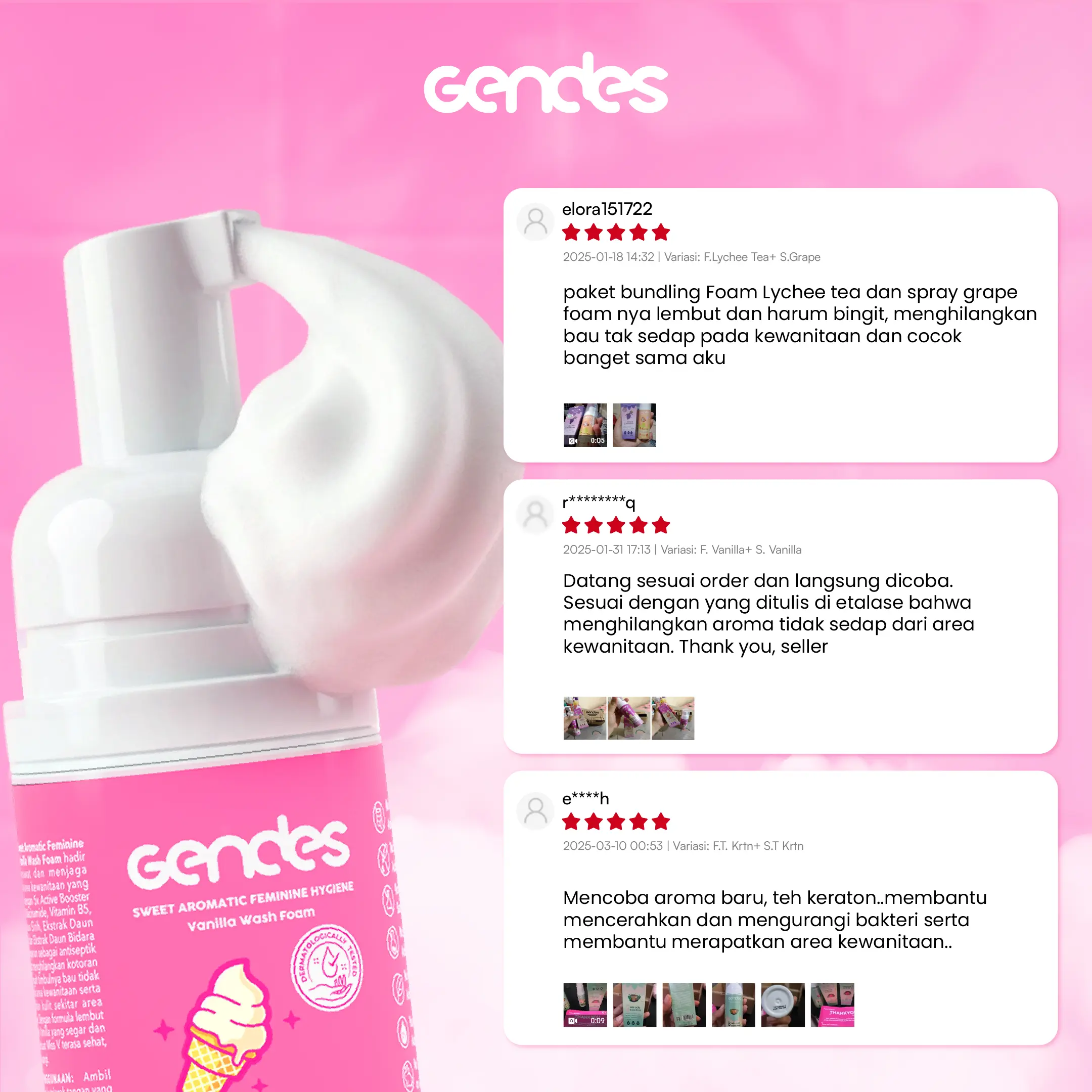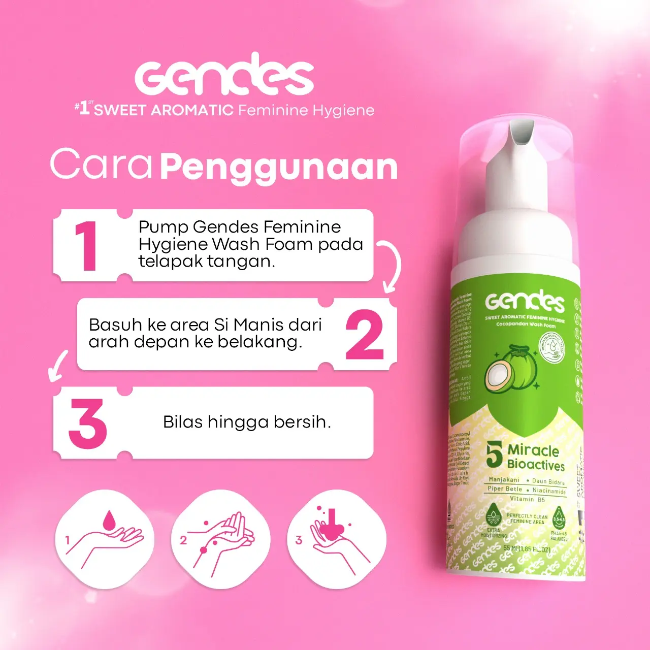 Gendes Sweet Aromatic Feminine Hygiene Wash Foam dengan formula “5 Miracle Bioactives” yang membantu menyeimbangkan pH area kewanitaan dan membersihkan secara lembut.