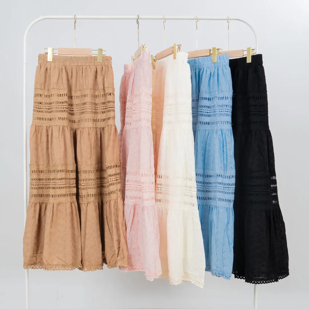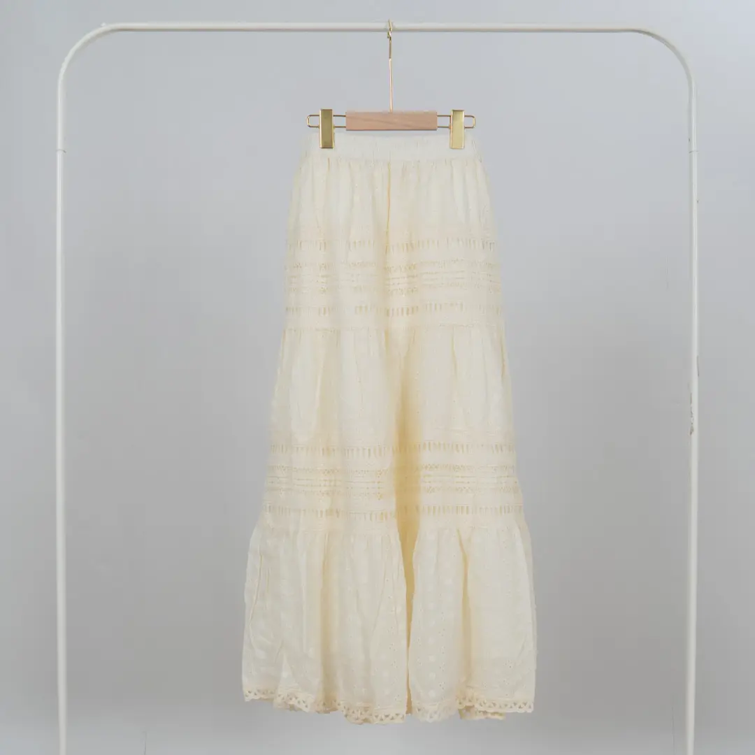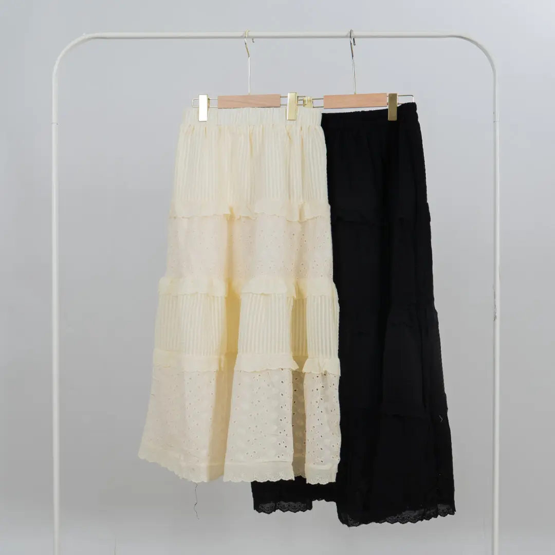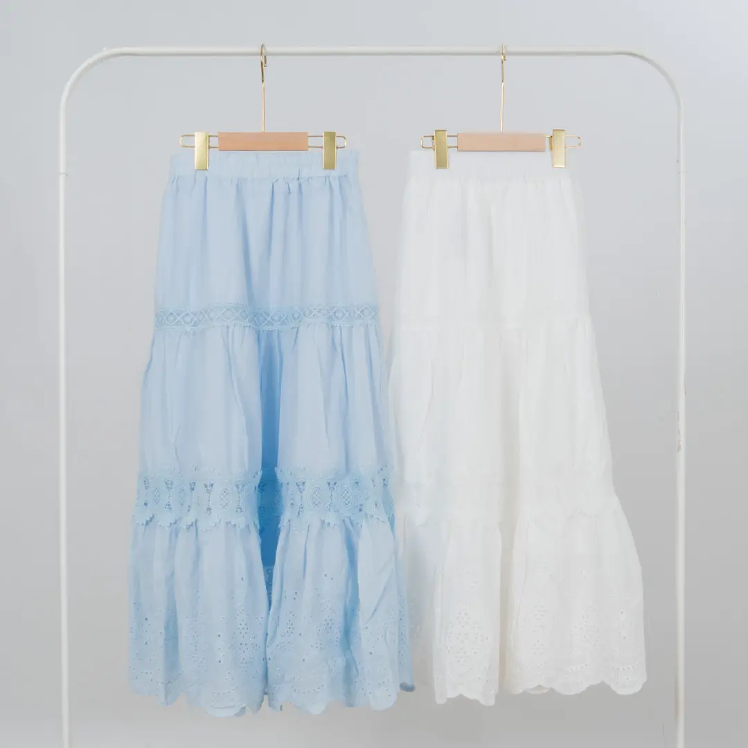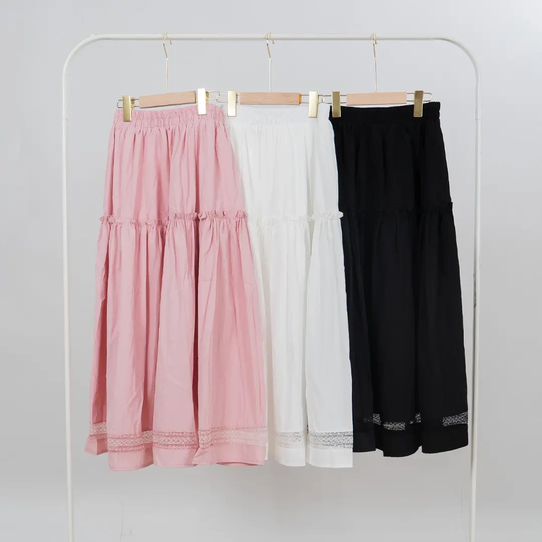 Bahan brokat bordir yang cantik dan feminin Model bertingkat (tiered skirt) dengan detail renda/lace Pinggang elastis yang nyaman dipakai
