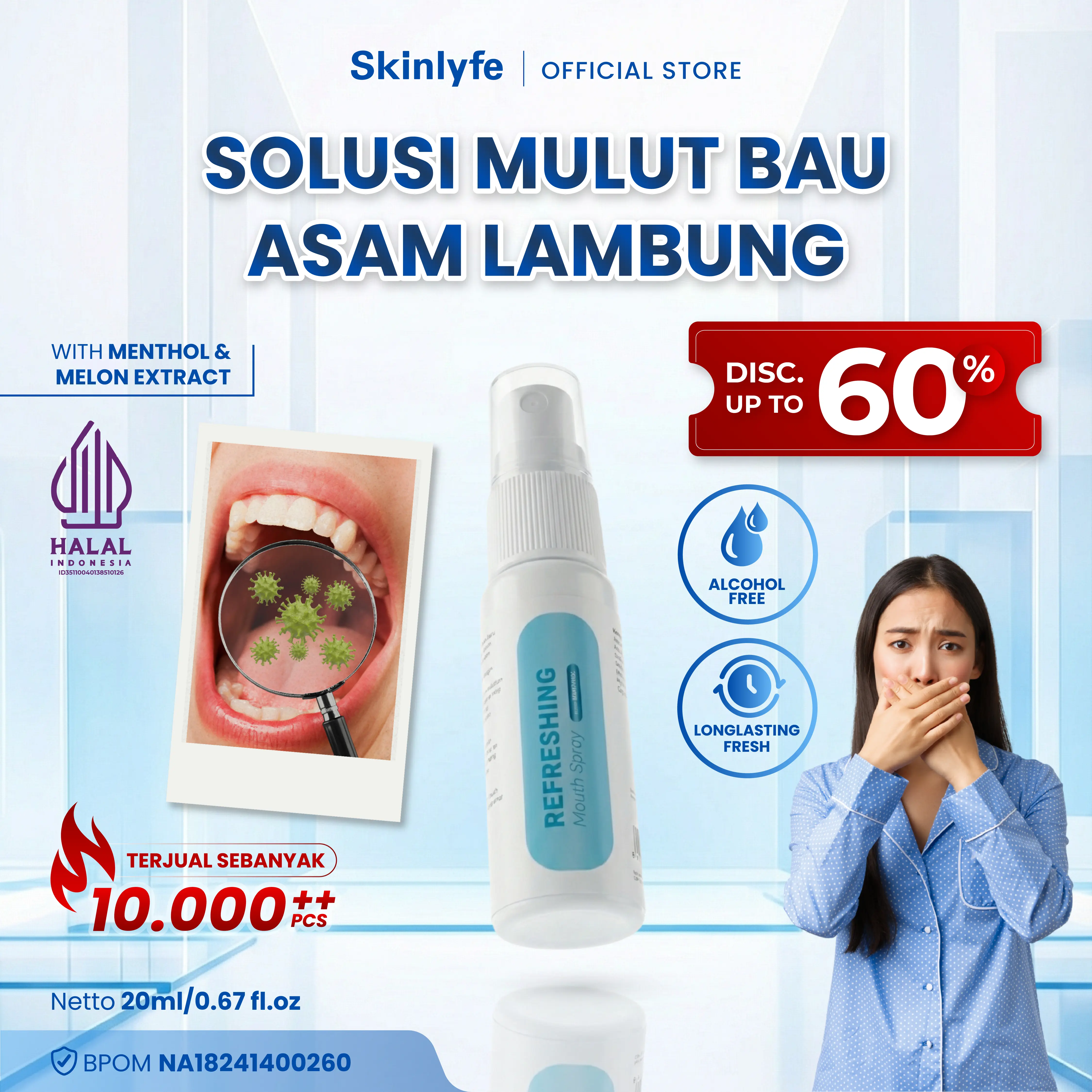 Skinlyfe Refreshing Mouthspray With Menthol adalah mouthspray dengan 0% alkohol yang diperkaya dengan bahan pilihan untuk membantu menyegarkan dan mencegah bau mulut dengan memberikan sensasi segar dan dingin.