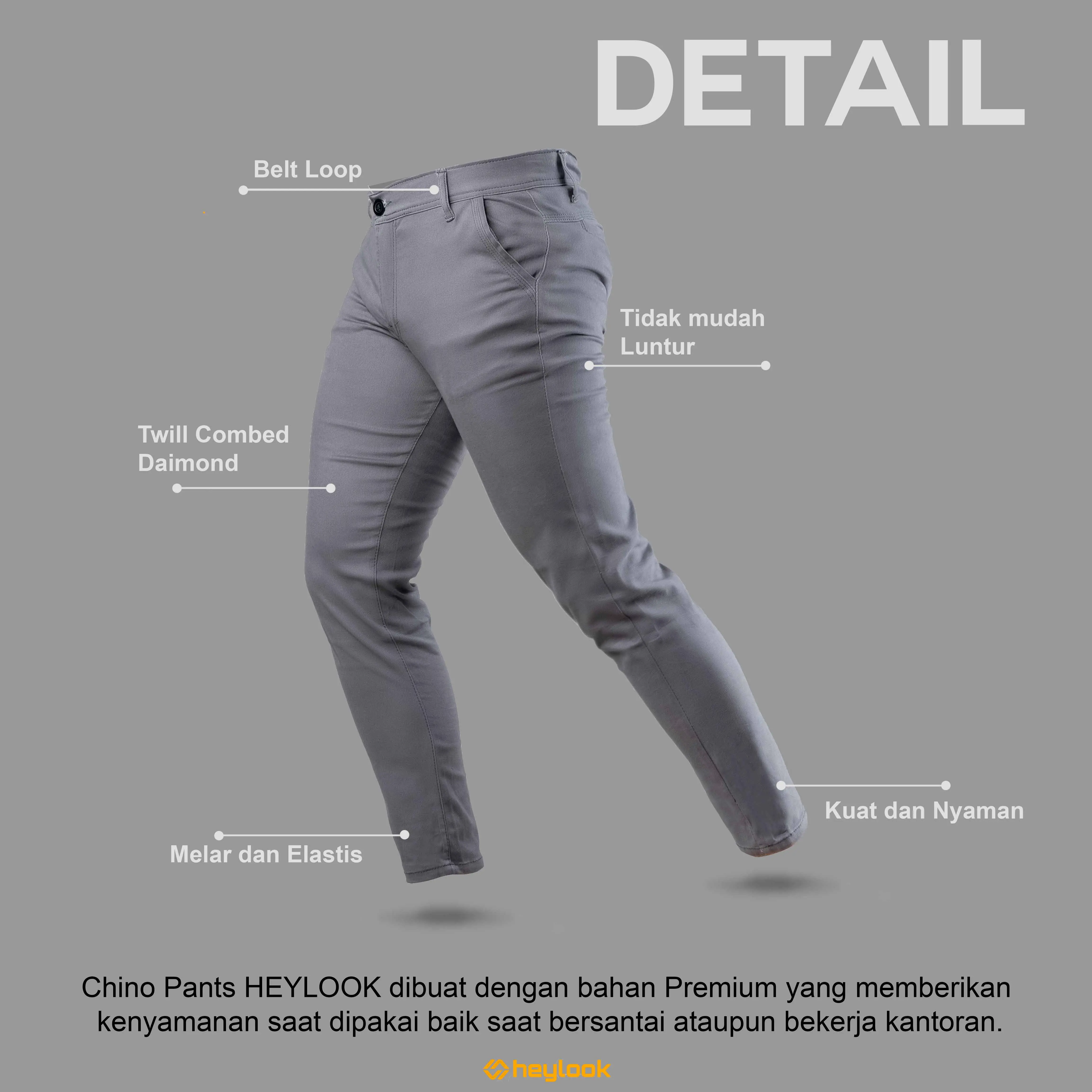 Chino Pants HEYLOOK dibuat dengan bahan Premium yang memberikan kenyamanan saat dipakai baik saat bersantai ataupun bekerja kantoran.