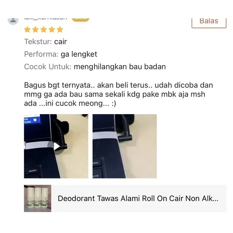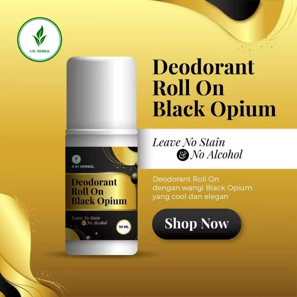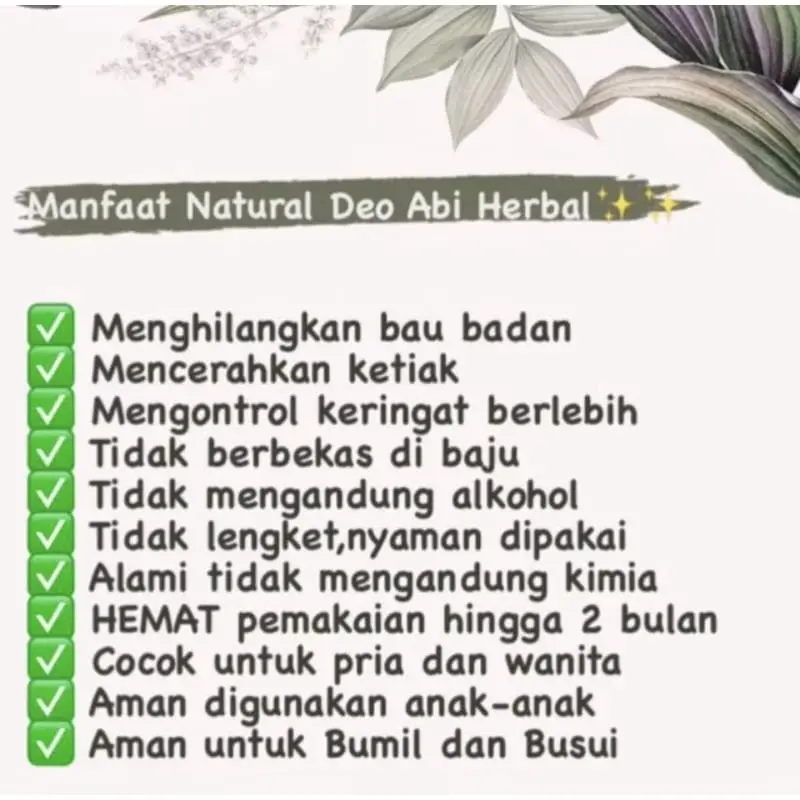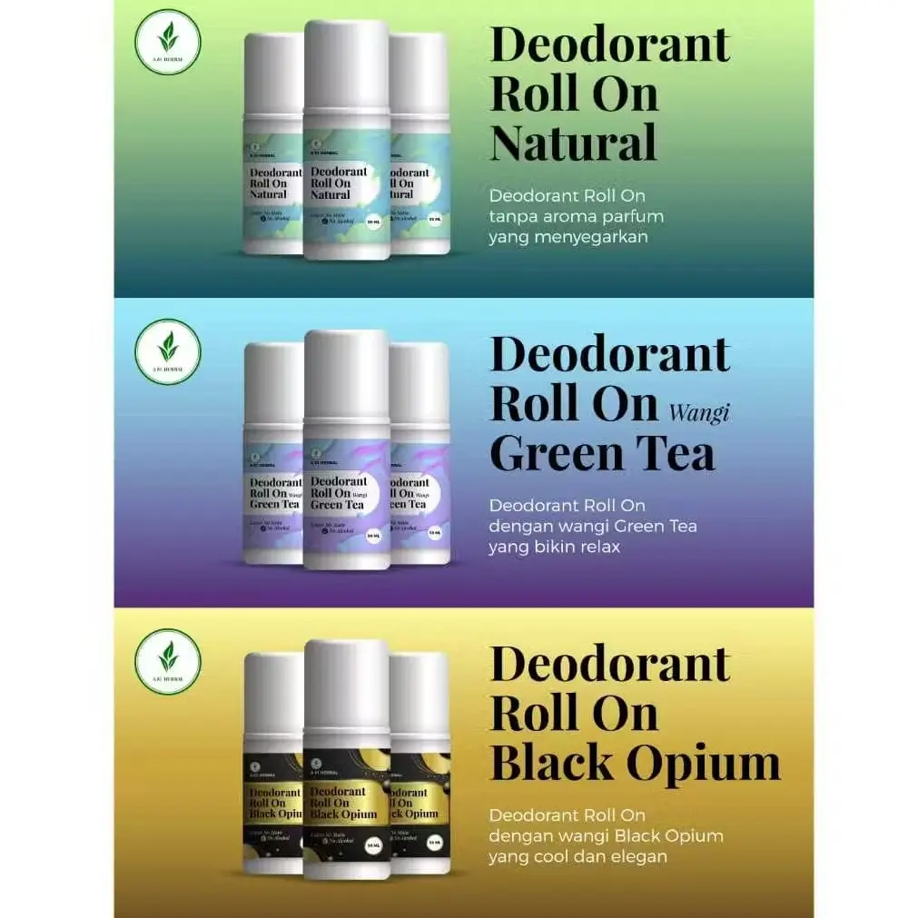DEODORANT ROLL ON ABI HERBAL (A 81 HERBAL) ukuran 50ml Terbuat dari Tawas Alami Non Alkohol tekstur Cair agak Kental Cara Pemakaian Oleskan pada ketiak setiap habis mandi pagi & sore hari Manfaat Pemakaian Deodorant Roll On Ketiak tidak bau dan tetap kering Mencerahkan & nyaman seharian Lebih percaya diri Mudah digunakan Dapat digunakan untuk Sholat & Umroh Tidak berbekas dibaju Aman digunakan untuk Bumil & Busui Tersedia Tiga Variant Pilihan Natural Green Tea Black Opium No Paraben No Alkohol BPOM Lihat diKemasan